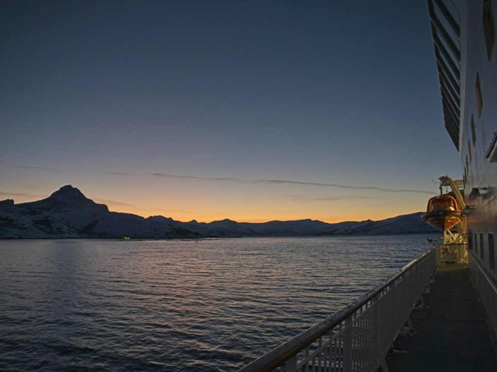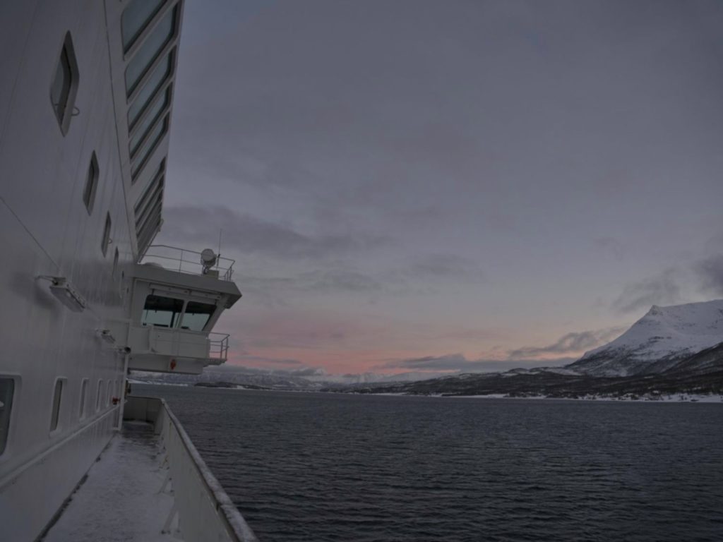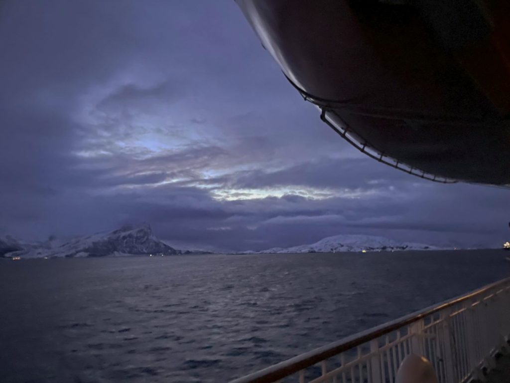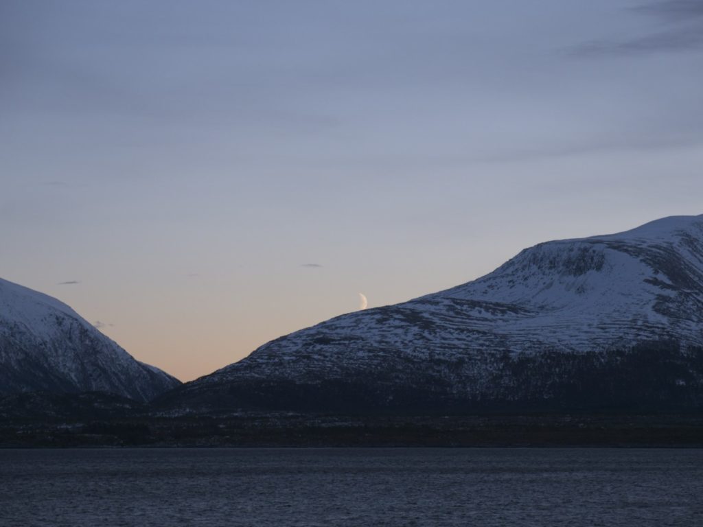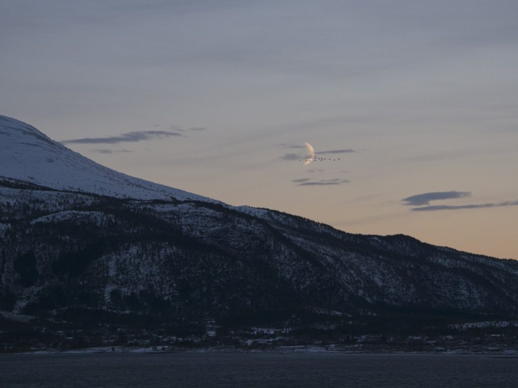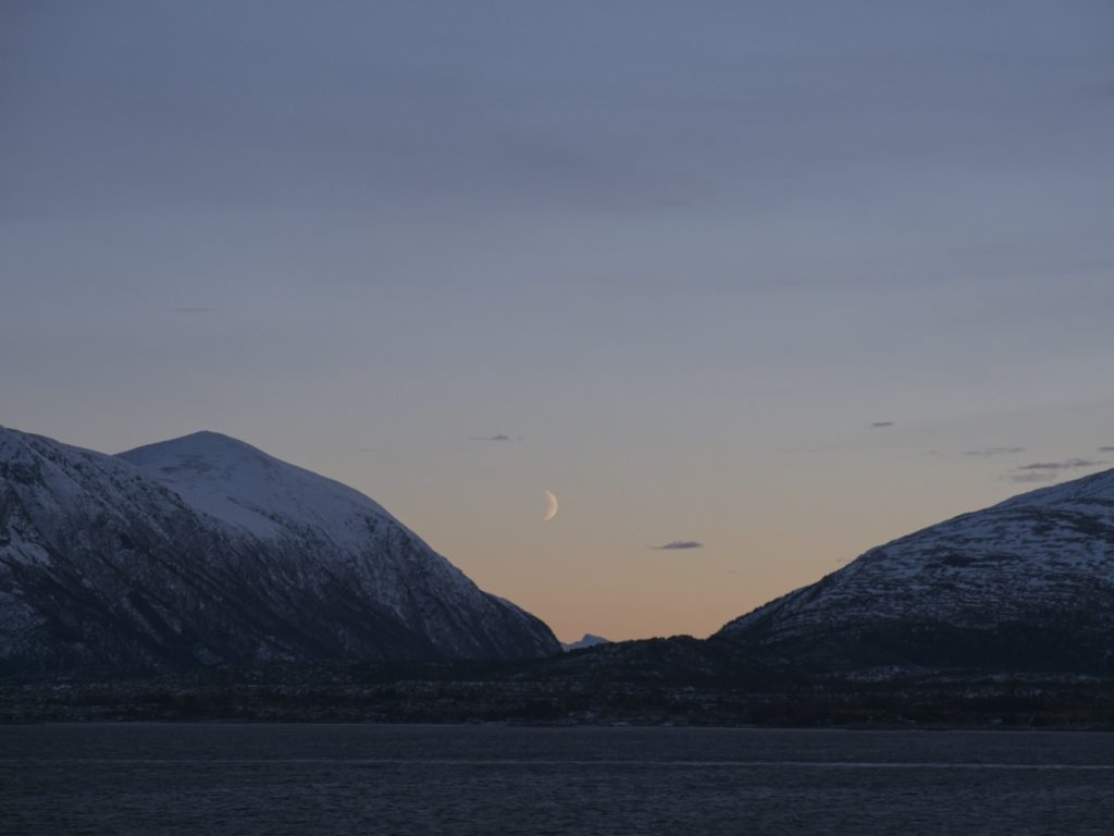 Unser nächster Hafen ist Kristiansund um 16:30, sodass ich jetzt tatsächlich Pause habe. Kofferpacken (und wiegen!) mache ich später. Und an Backbord schimmert die Mondsichel zwischen den Bergen hervor, vielleicht 4° über dem Horizont. Herrlich!