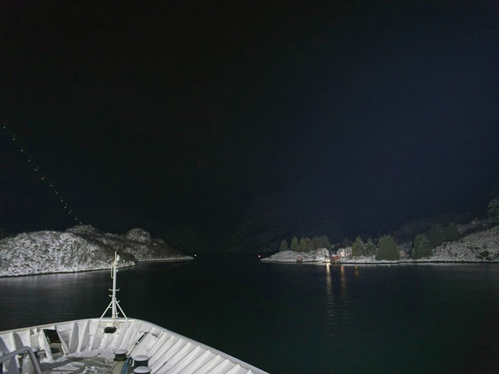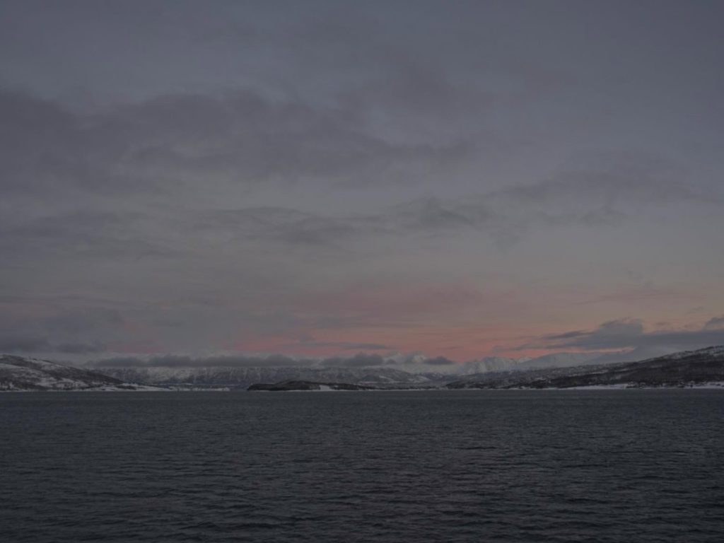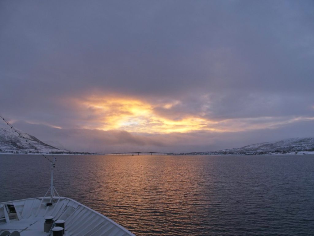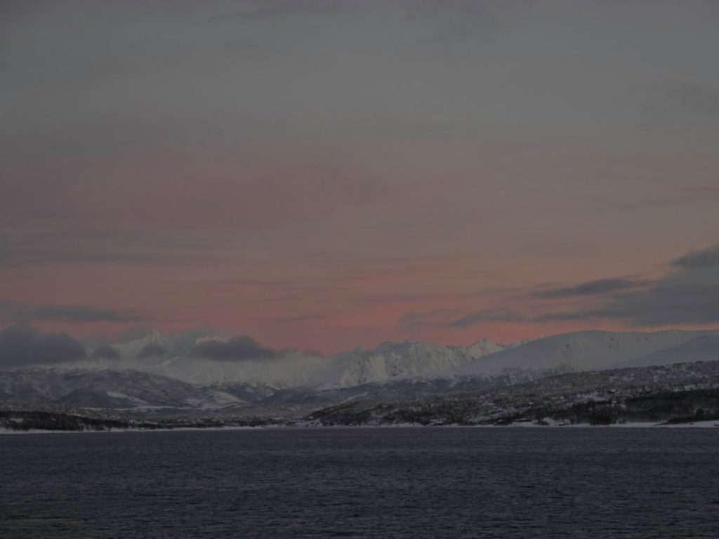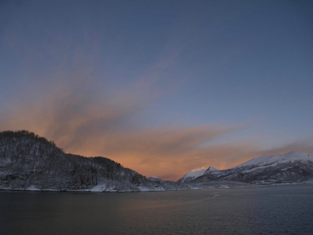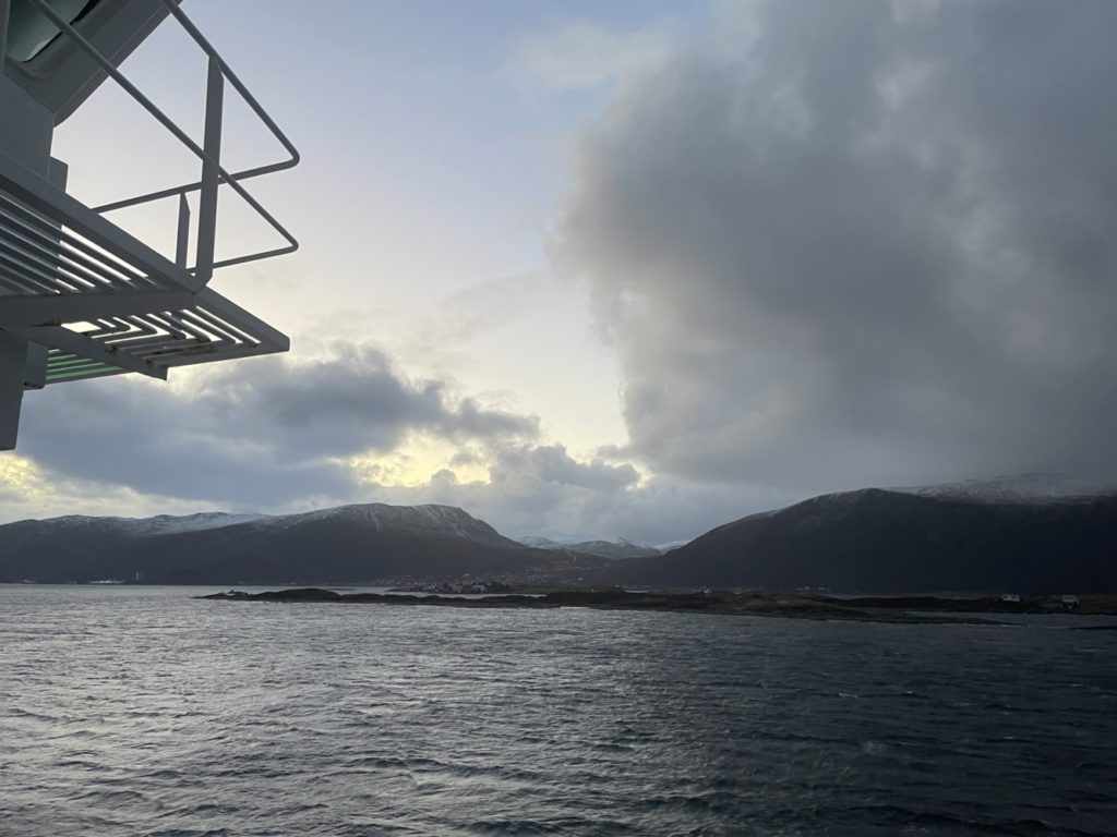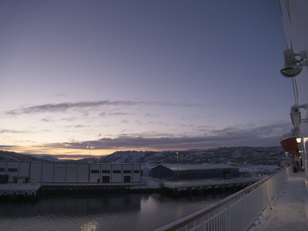 Unser nächster Hafen ist Kristiansund um 16:30, sodass ich jetzt tatsächlich Pause habe. Kofferpacken (und wiegen!) mache ich später. Und an Backbord schimmert die Mondsichel zwischen den Bergen hervor, vielleicht 4° über dem Horizont. Herrlich!