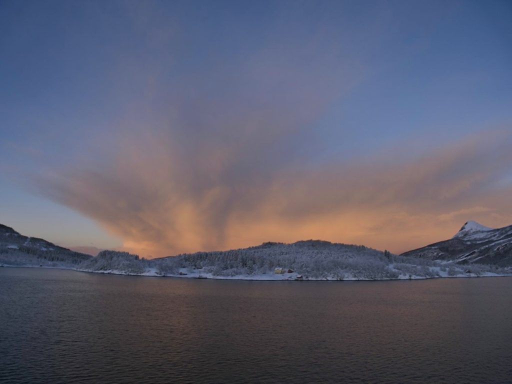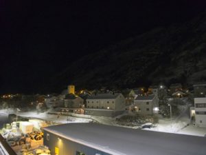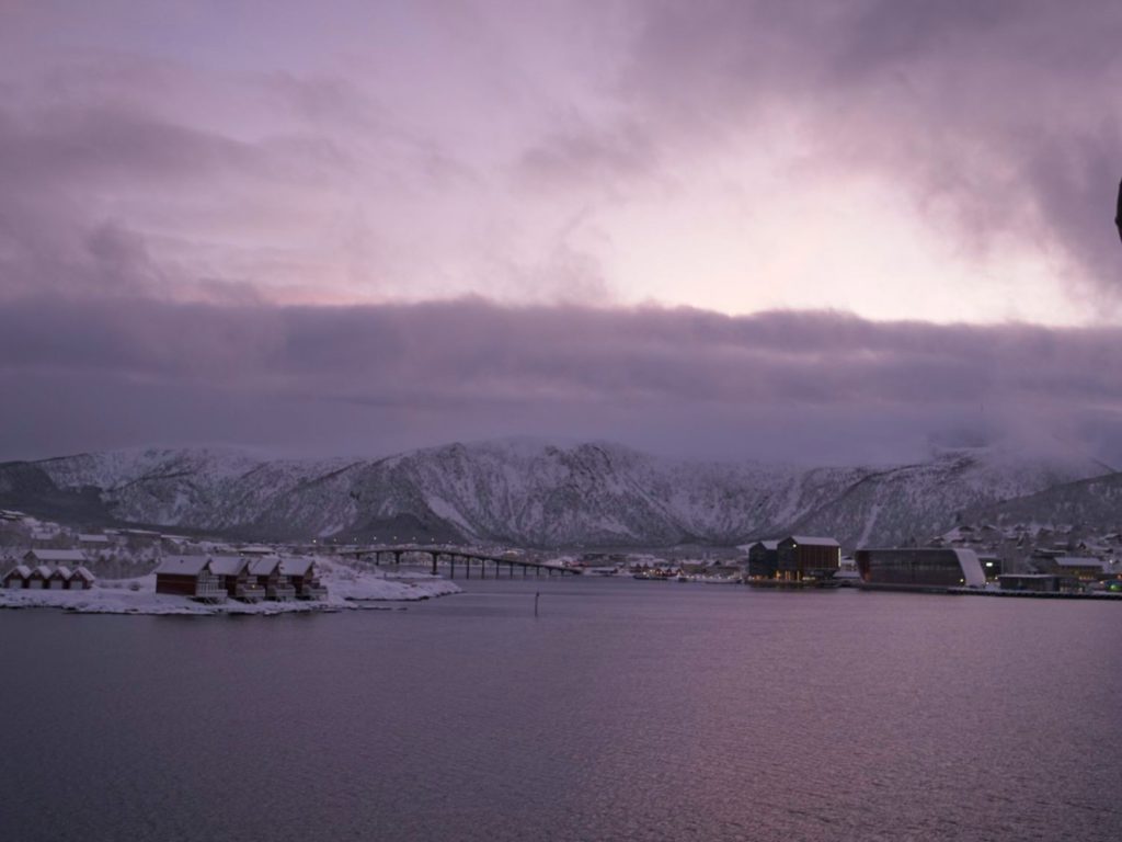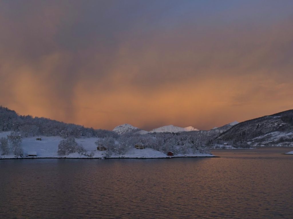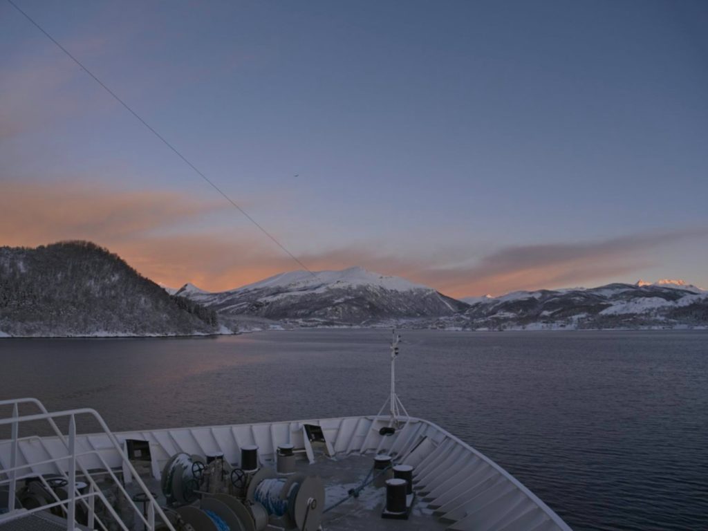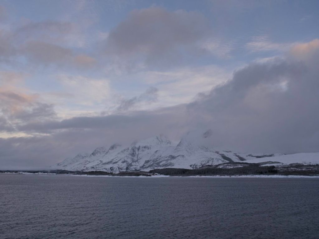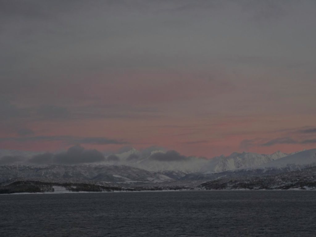 Unser nächster Hafen ist Kristiansund um 16:30, sodass ich jetzt tatsächlich Pause habe. Kofferpacken (und wiegen!) mache ich später. Und an Backbord schimmert die Mondsichel zwischen den Bergen hervor, vielleicht 4° über dem Horizont. Herrlich!