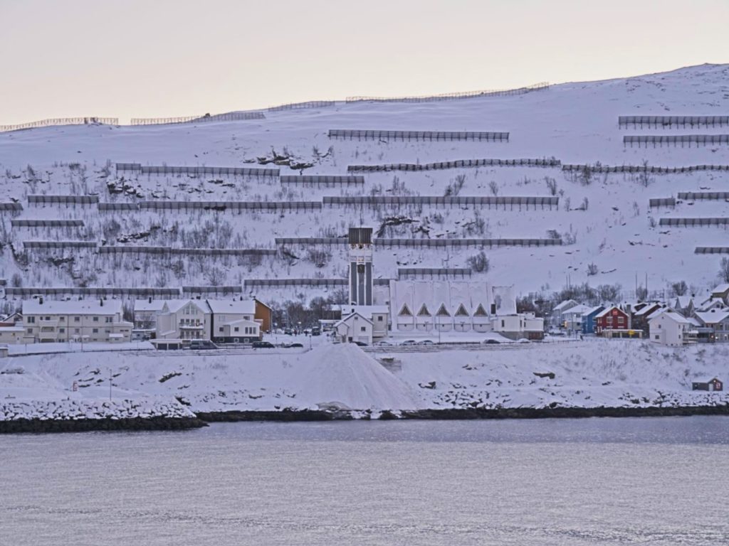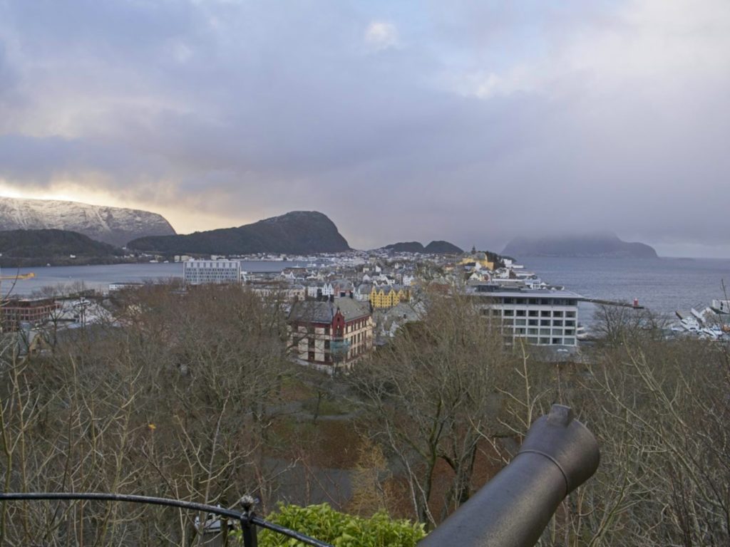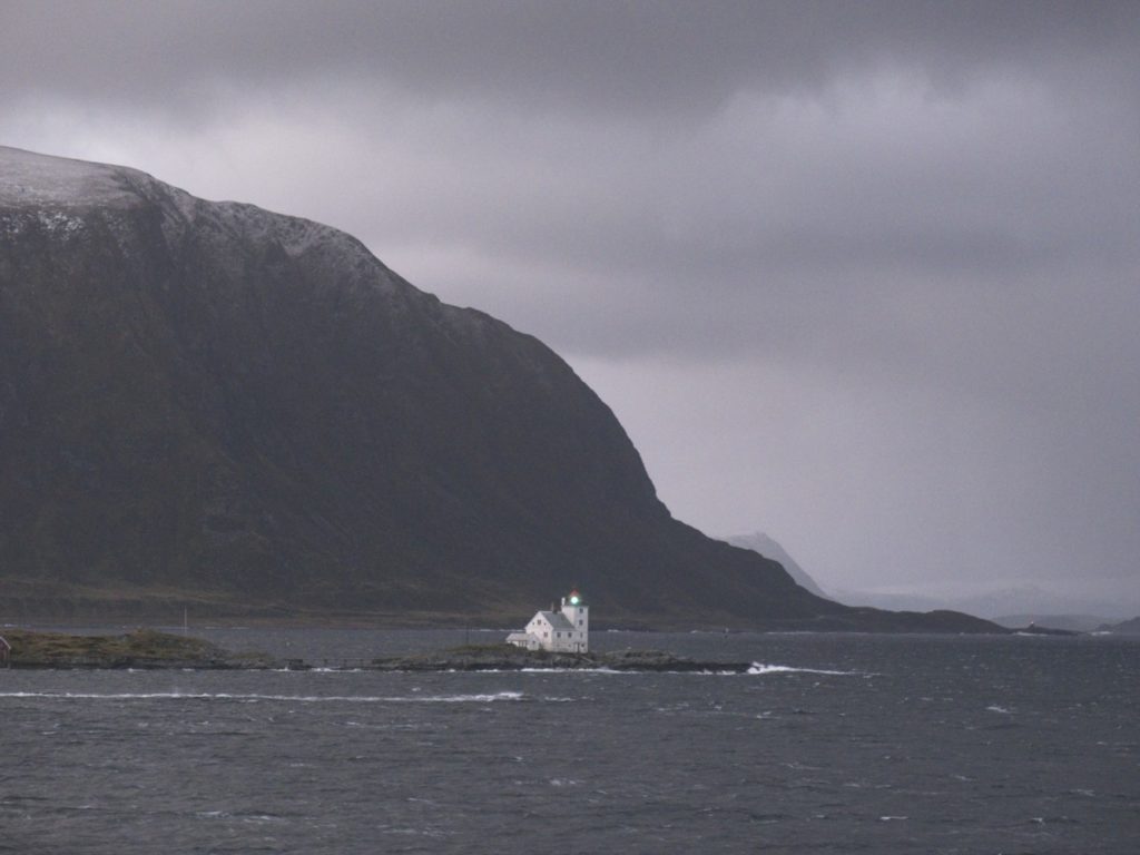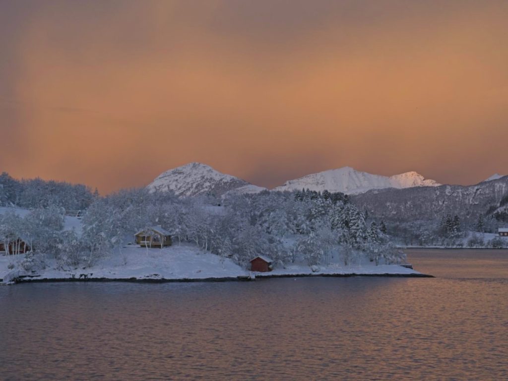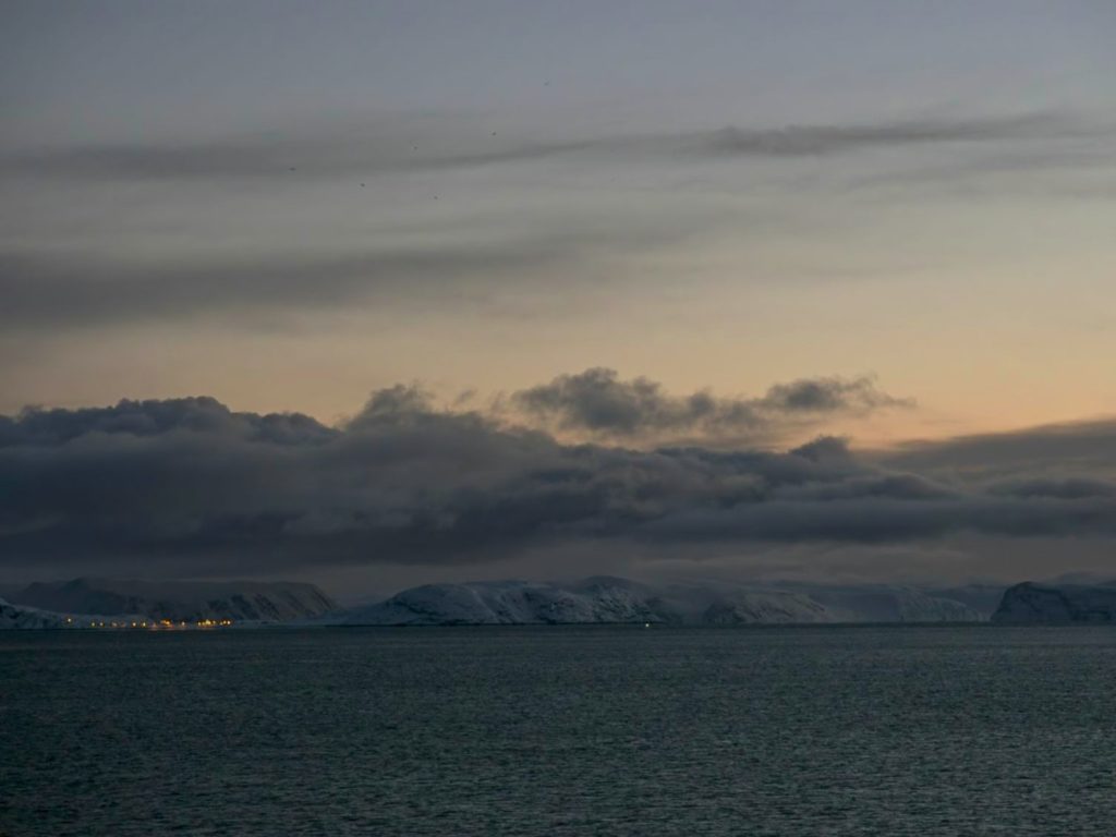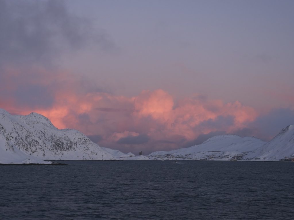 Unser nächster Hafen ist Kristiansund um 16:30, sodass ich jetzt tatsächlich Pause habe. Kofferpacken (und wiegen!) mache ich später. Und an Backbord schimmert die Mondsichel zwischen den Bergen hervor, vielleicht 4° über dem Horizont. Herrlich!