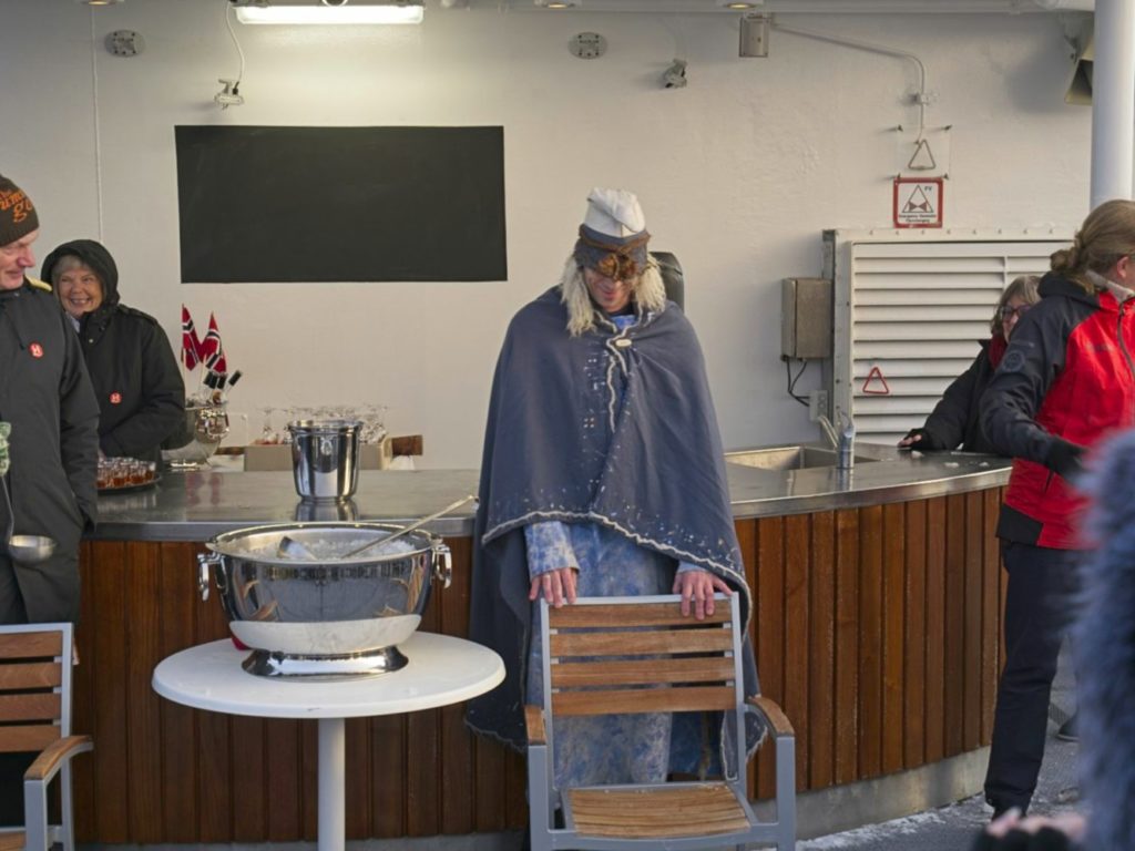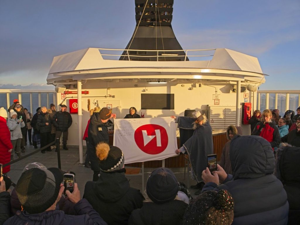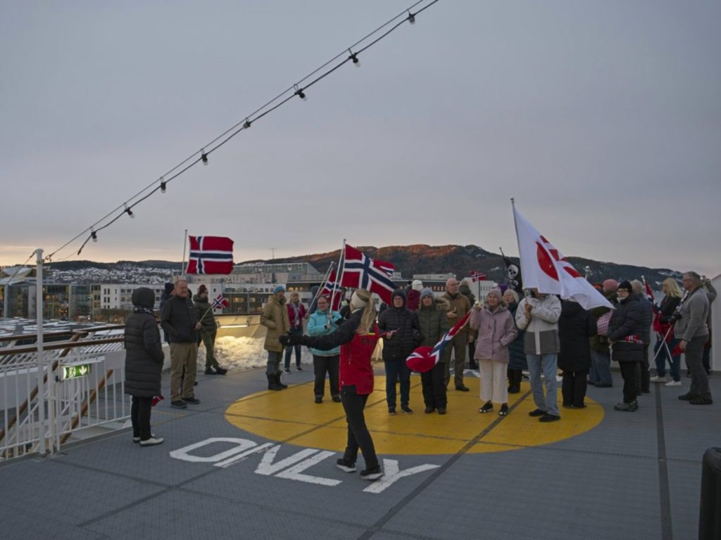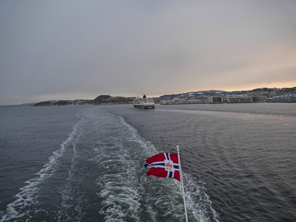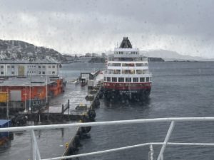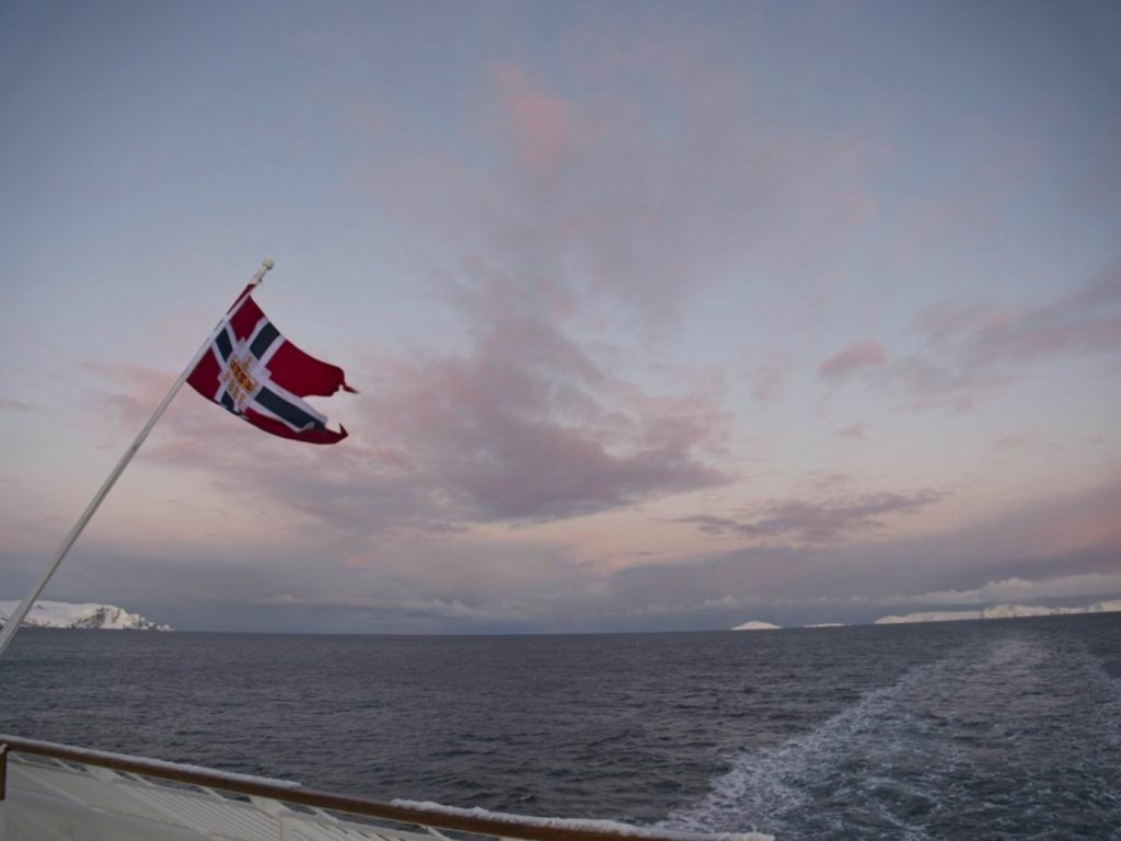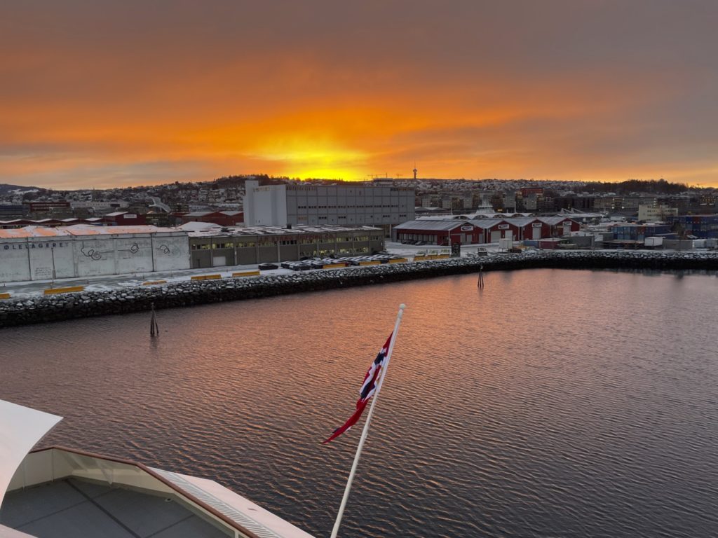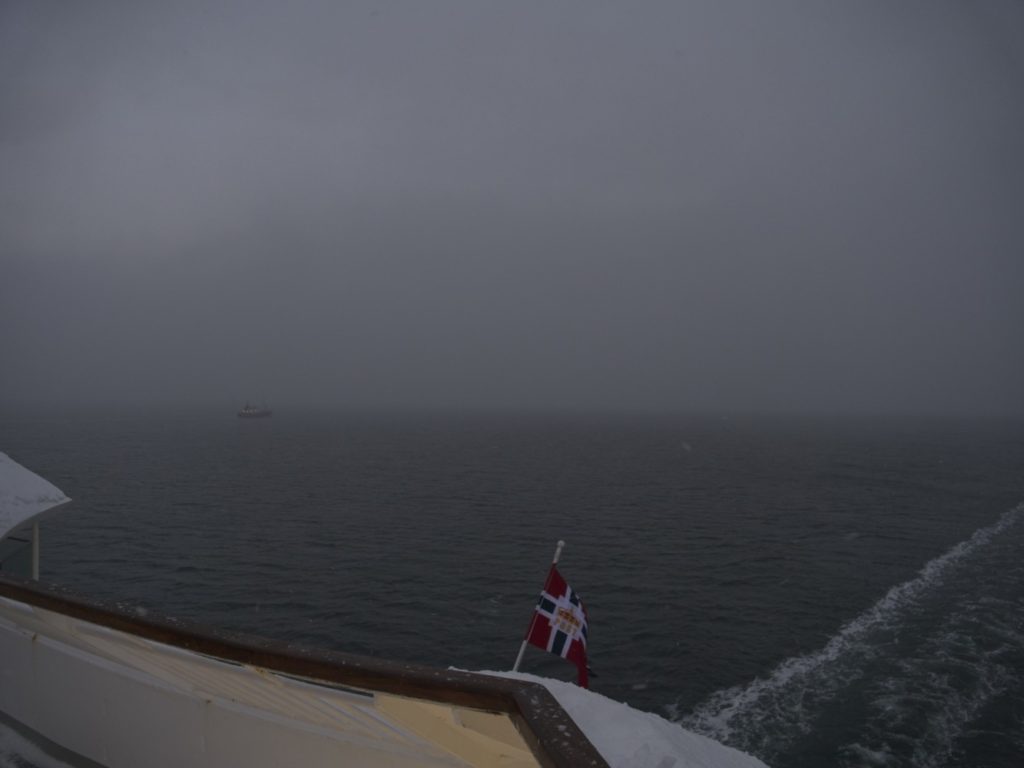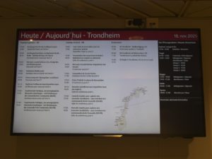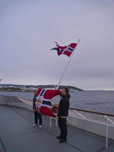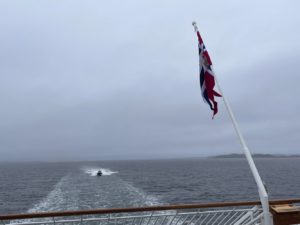 Der letzte volle Tag an Bord ist noch einmal stressig, zumindest für mich. In Trondheim muss ich nicht noch einmal von Bord, es gibt also fast die Möglichkeit auszuschlafen – dafür hat der Morgen volles Programm. Um 9:30 verlassen wir Trondheim, und das geplante Einholen der Postschiff-Flagge samt Übergabe an den glücklichen Auktionsgewinner aus unserer Gruppe wird schon einmal auf später verschoben. So können wir nämlich direkt nach dem Auslaufen der nordgehenden Midnatsol winken. Eine Winkekonkurransje – der Gewinner? Nun, wir haben mit weniger Passagieren mehr Flaggen aufgeboten, daher können wir den Sieg wohl für uns in Anspruch nehmen.