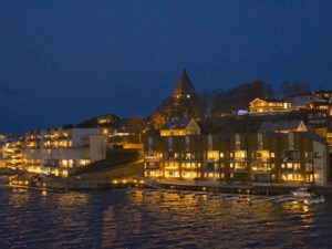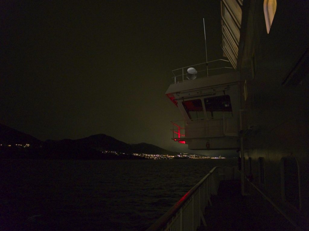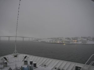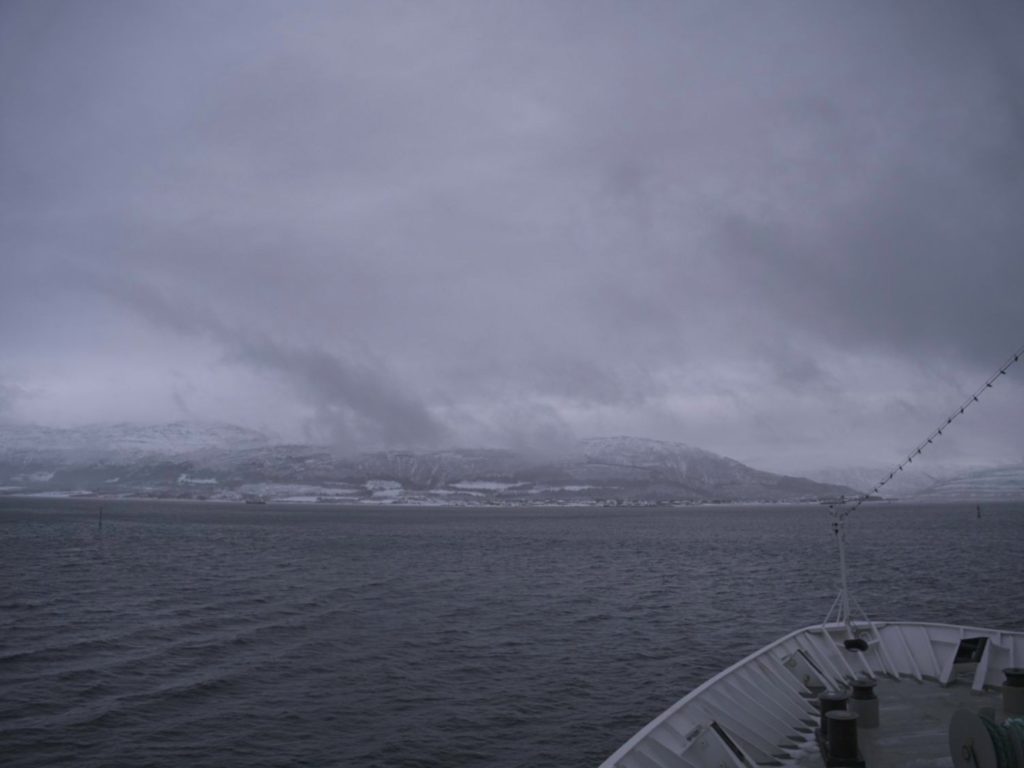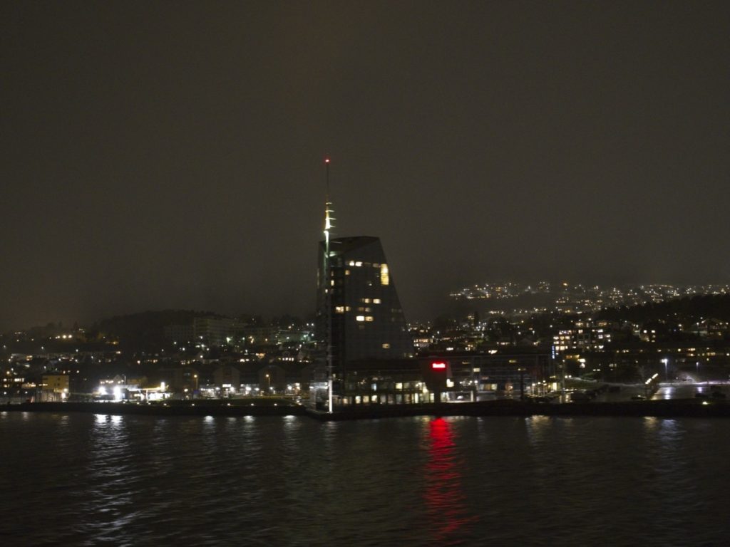 Bei angenehmen 8°C laufen wir Molde an, um die Ausflügler wieder an Bord zu nehmen. Die imposanten Berge, die im Tagesprogramm angepriesen werden, sind aber nur als Scherenschnitt zu erahnen. Das ist auch schon wieder der letzte Abend an Bord, morgen um die Zeit bin ich irgendwo im Flugzeug zwischen Amsterdam und Stuttgart, wenn nichts dazwischen kommt. Noch einmal die See genießen.