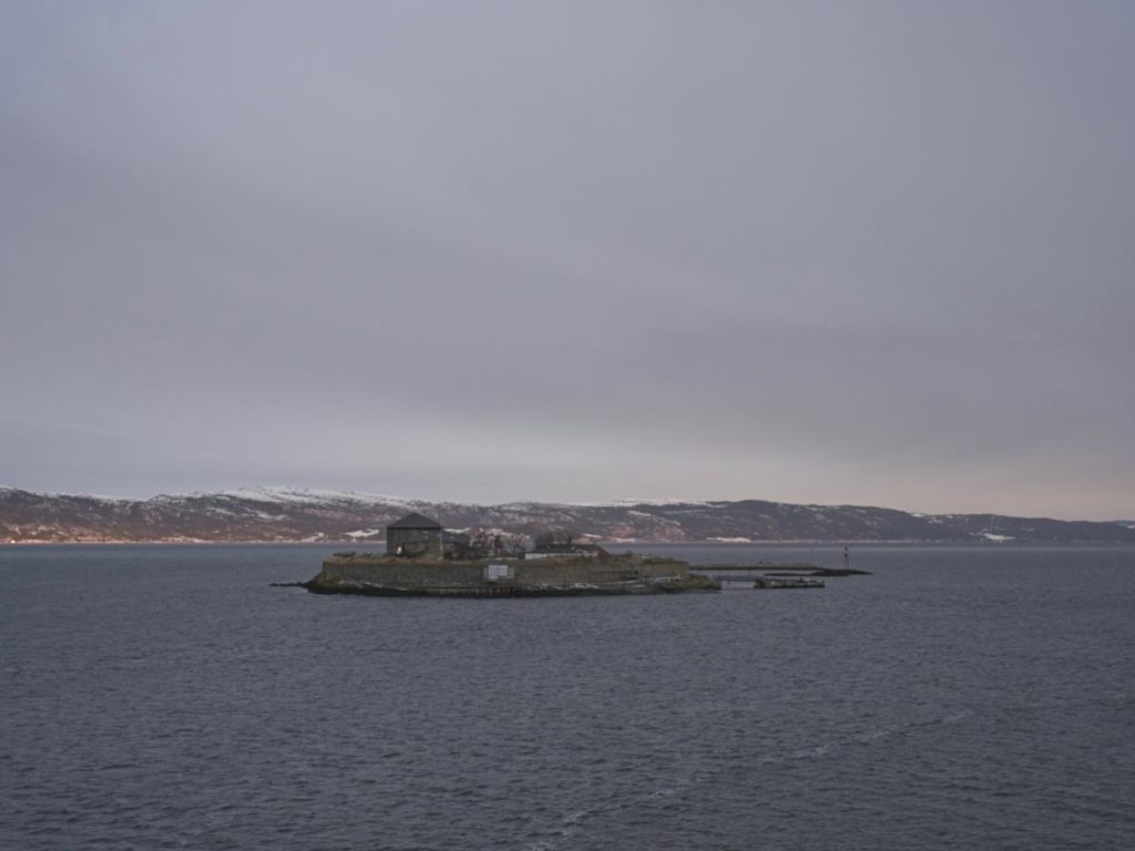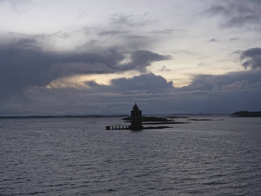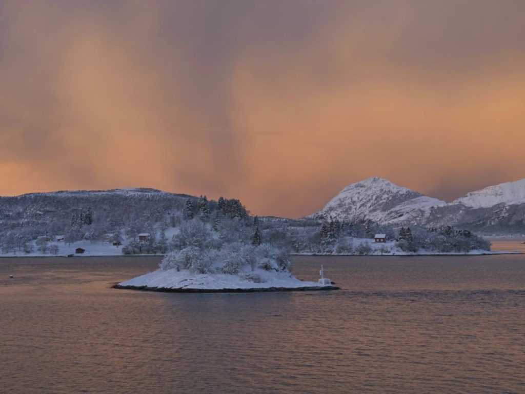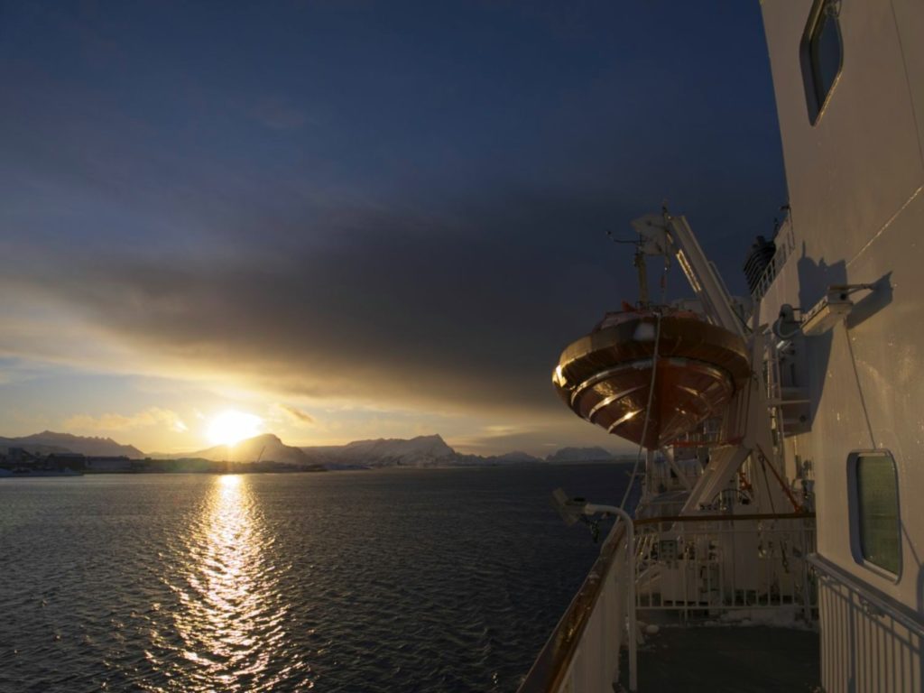 Die Schiffsbegegnung fällt auch mit dem Interessepunkt zur Insel Munkholmen zusammen, es lohnt sich also, auf Deck 7 zu sein. Der Morgenhimmel bei Sonnenafgang: Ein Traum!