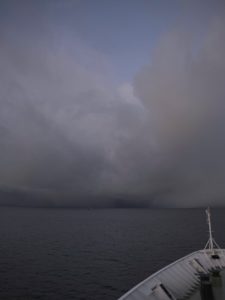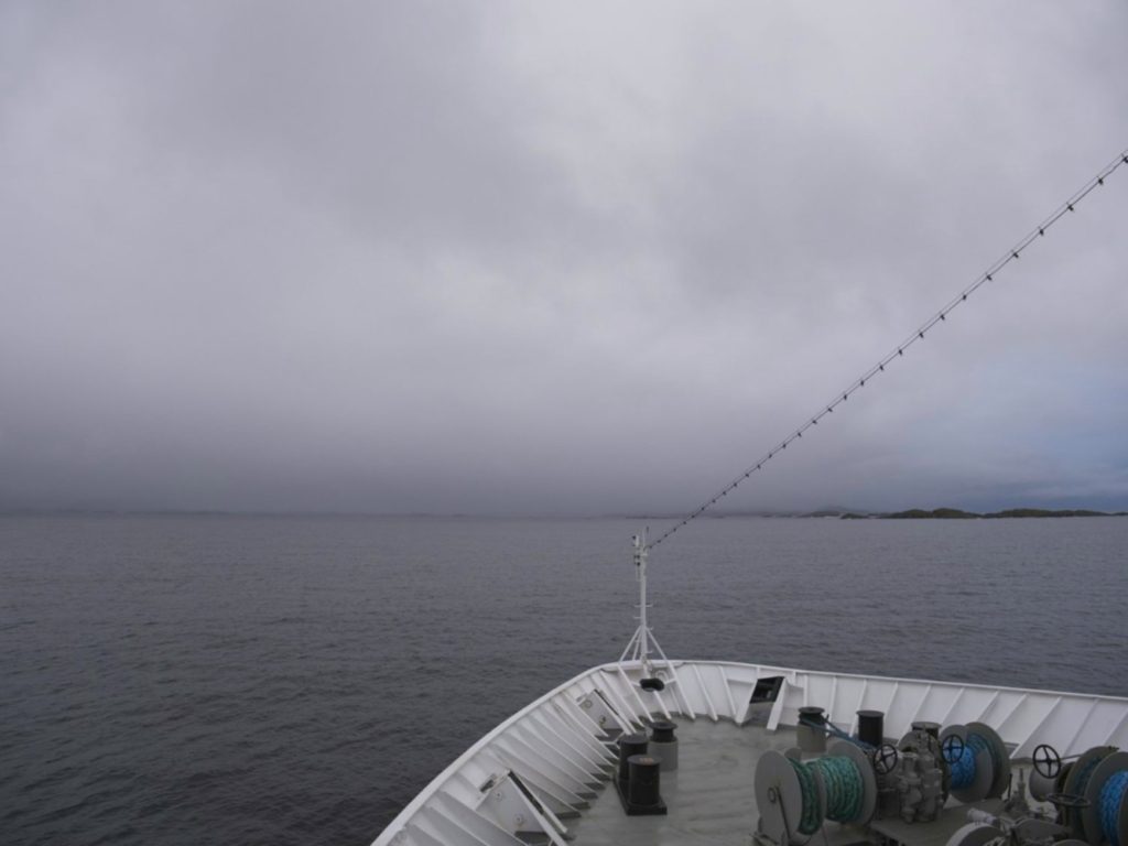 Gegen 10:40 gibt es noch einmal einen Programmpunkt: Wir kommen in den wunderschönen Steinsund, und auf Deck 7 läuft dazu klassische norwegische Musik. Ich werfe einen Blick auf Deck 5: Hinter und schönes Wetter, rechts einige Schären, voraus eine Regenfront. Auch schön. Da gehe ich doch freiwillig wieder in das Schiff, auch wenn Temperaturen um die 8° und wenig Wind nicht unangenehm sind.