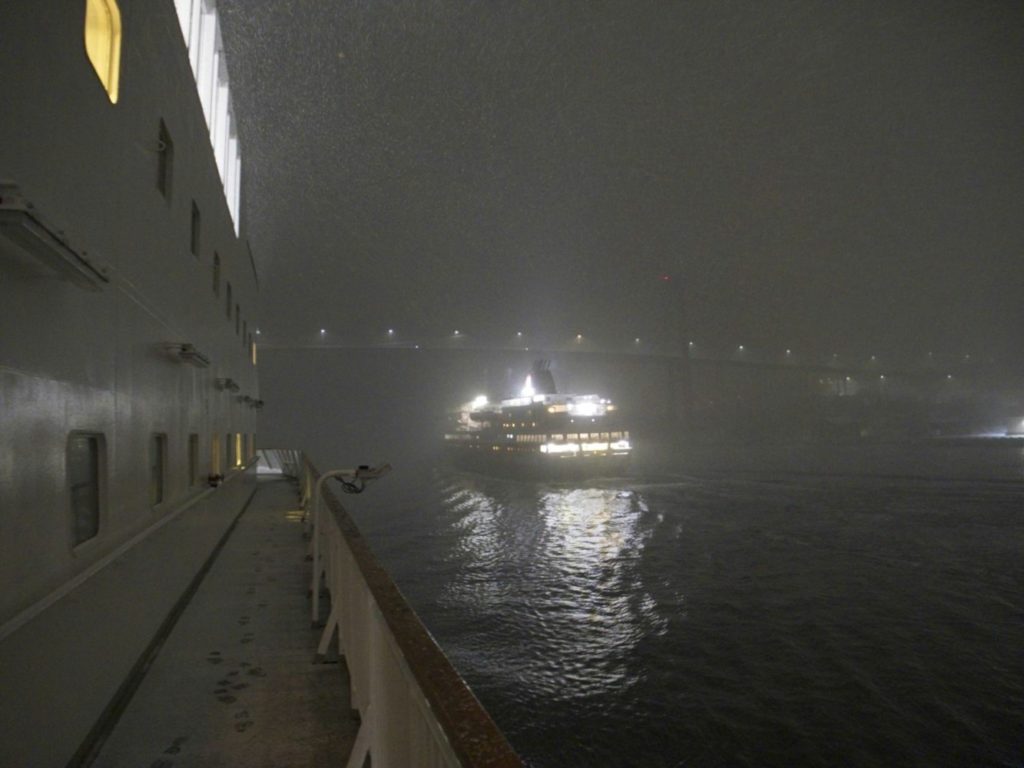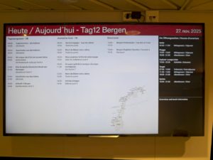 Das klingt aber spektakulärer als es tatsächlich war, zumindest von Deck 4 aus. Von den Außendecks wäre vielleicht mehr zu sehen gewesen, aber da ich ja nicht zum Spaß auf dem Schiff bin, habe ich den Gepäckservice nicht genutzt und mein Gepäck behalten – um zeitnah an unserem Bus zu stehen und die richtigen Leute in unseren Bus zu lotsen. Das ist bei größeren Gruppen natürlich interessanter, aber so will ich nicht alles hier unbewacht rumstehen lassen. Ein abschließbarer Fotorucksack, den ich ohne Bedenken im frei zugänglichen Konferenz-/Gepäckraum stehen lassen kann, hätte schon seinen Reiz – aber mein aktuelles Model hat mehr normalen Stauraum, auch wenn der Laptop frei zugänglich wäre. Als Touri hätte ich nur meine Kamera dabei und könnte das besser genießen. Aber draußen ist es heute auch nicht so einladend.