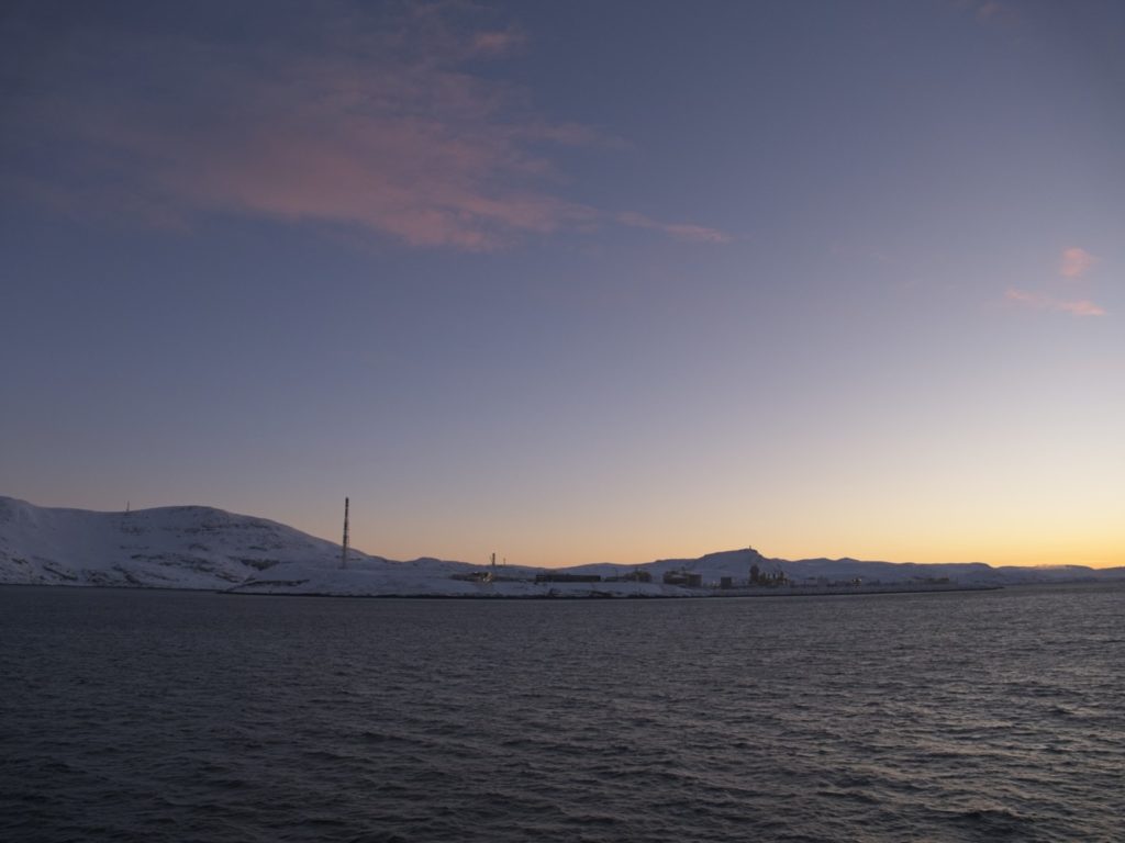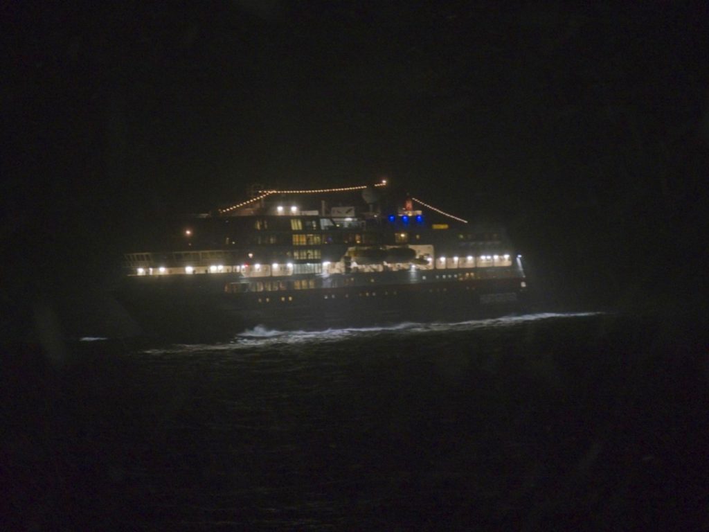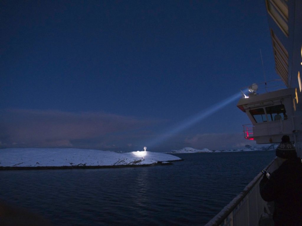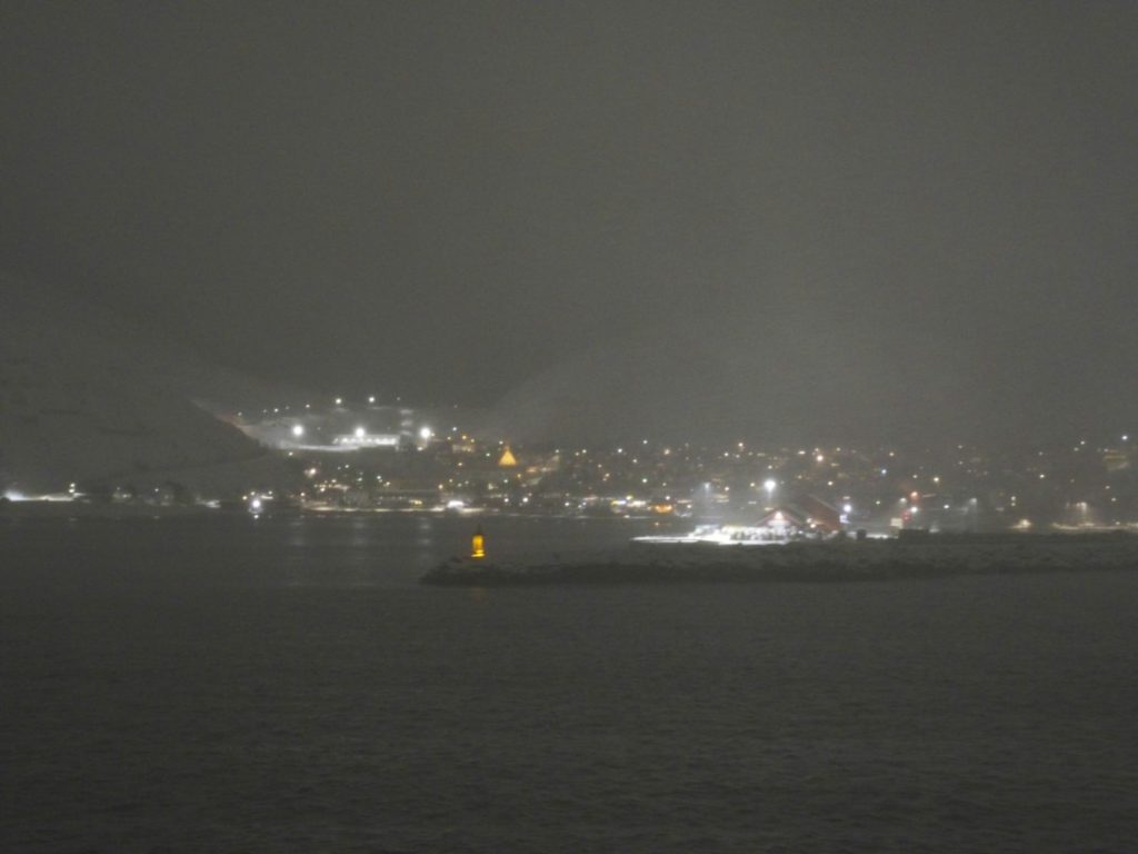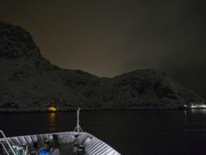 Ormen Lange ist eine riesige Industrieanlage, die 20% der Erdgasbedarfs von Großbritannien deckt. Wir sehen von ihr nur ein riesiges Lichterfeld in der Finsternis, auf das uns eine Durchsage gegen 20:30 hinweist.