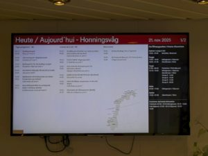 Aber irgendwann erreichen wir doch Bergen, sogar pünktlich, legen an, suchen den Bus, sammeln unsere Leute ein und fahren zum Flughafen. Bis auf den üblichen Stau an einem Verkehrsknotenpunkt klappt das auch. Die Schlange an der Security ist recht lang, aber die Norweger haben die Effizienz, die den Deutschen nachgesagt wird, sodass noch genug Zeit für Tax Refund und Duty Free Shopping bleibt. Linie Aquavit kostet 419 NOK pro Liter (aktuell 35€), im Gegensatz zu 24€ in Deutschland – kein Schnäppchen. Da lieber eine Sorte nehmen, die es in Deutschland nicht so leicht gibt. Bivröst kommt immerhin aus Tromsø, aus der nördlichsten Whisky-Destillerie der Welt in den nahe gelegenen Lyngen-Alpen.