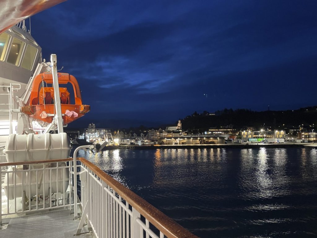 Das ist für mich dann auch der Zeitpunkt, meine späte Mittagspause zu beenden. Auf Deck 7 ist nicht viel los – entweder sind alle mit Kofferpacken beschäftigt, oder auf Ausflug. Ich mache es mir im Multe bequem und aktualisiere mein Blog, bis wir kurz nach 21:15 Molde erreichen. Zeit, auf Deck 5 zu gehen.
