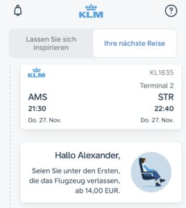 Nun, KLM tut wieder sein bestes. Wir landen um 19:40 in Amsterdam, bleibt eine Stunde, und von Terminal D zu B zu gehen. Das passt ganz gut, ohne Stress. Dass am B-Terminal praktisch kein Sitzplatz zu ergattern ist, bin ich ja gewohnt. Aber für die knappe Stunde, die ich noch habe, finde ich ein Plätzchen, bis das Boarding endlich losgeht. Die App bietet mir noch ein Sitzplatzupgrade an: Seien Sie ab 14€ Aufpreis unter den Ersten, die das Flugzeug verlassen.
