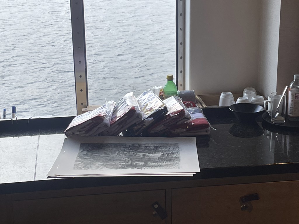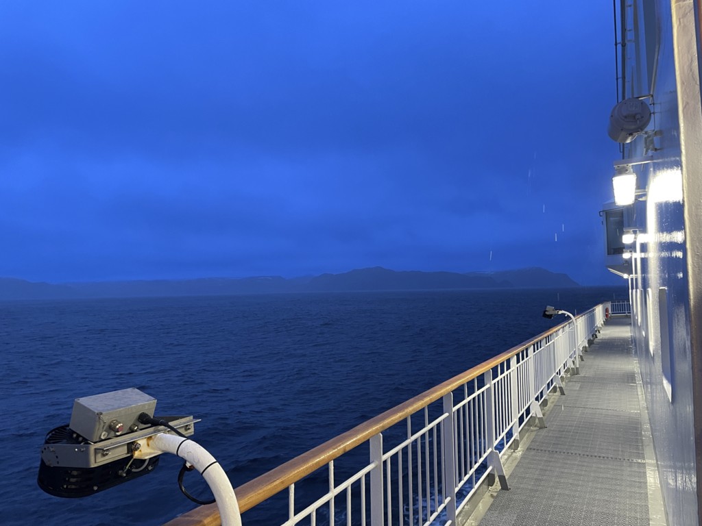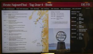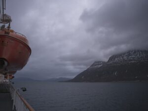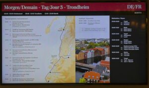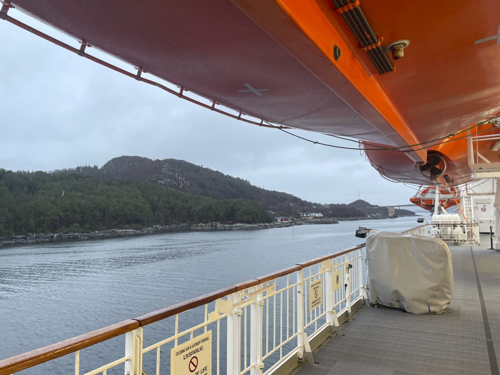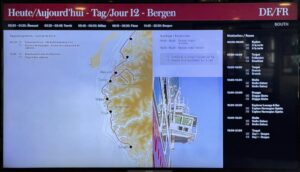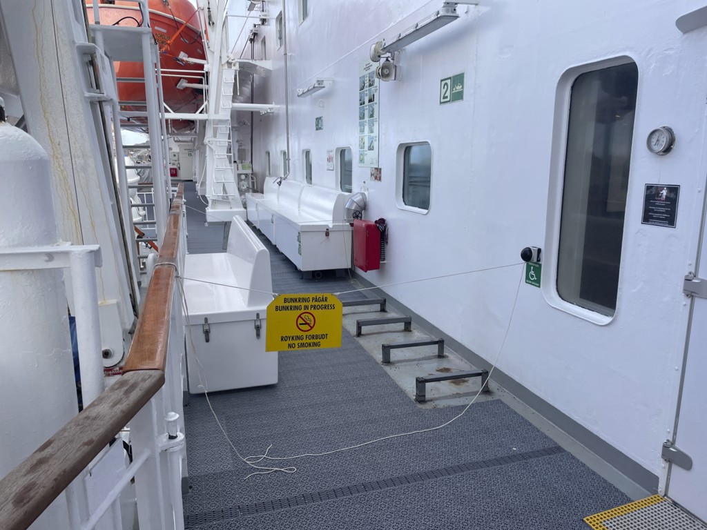Während wir auf die Ankunft in Bergen warten, wird an Bord schon die nächste Tour vorbereitet. An der Rezeption liegen neue Postflaggen und Bilder für die nächste Versteigerung (aber keine so schönen – Danke nochmal!), und die Essens- und Getränkepakete werden schon einmal angepriesen. Seit gestern werden auf Deck 3 die Matratzen ausgetauscht, und eine der Bänke/Lagerboxen auf Deck 5 wird ebenfalls ausgetauscht. Draußen ist es derweil windig, aber schön.