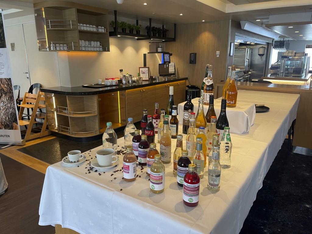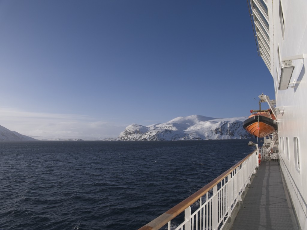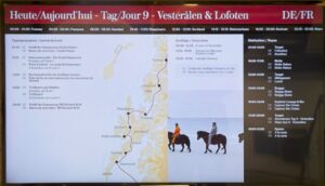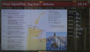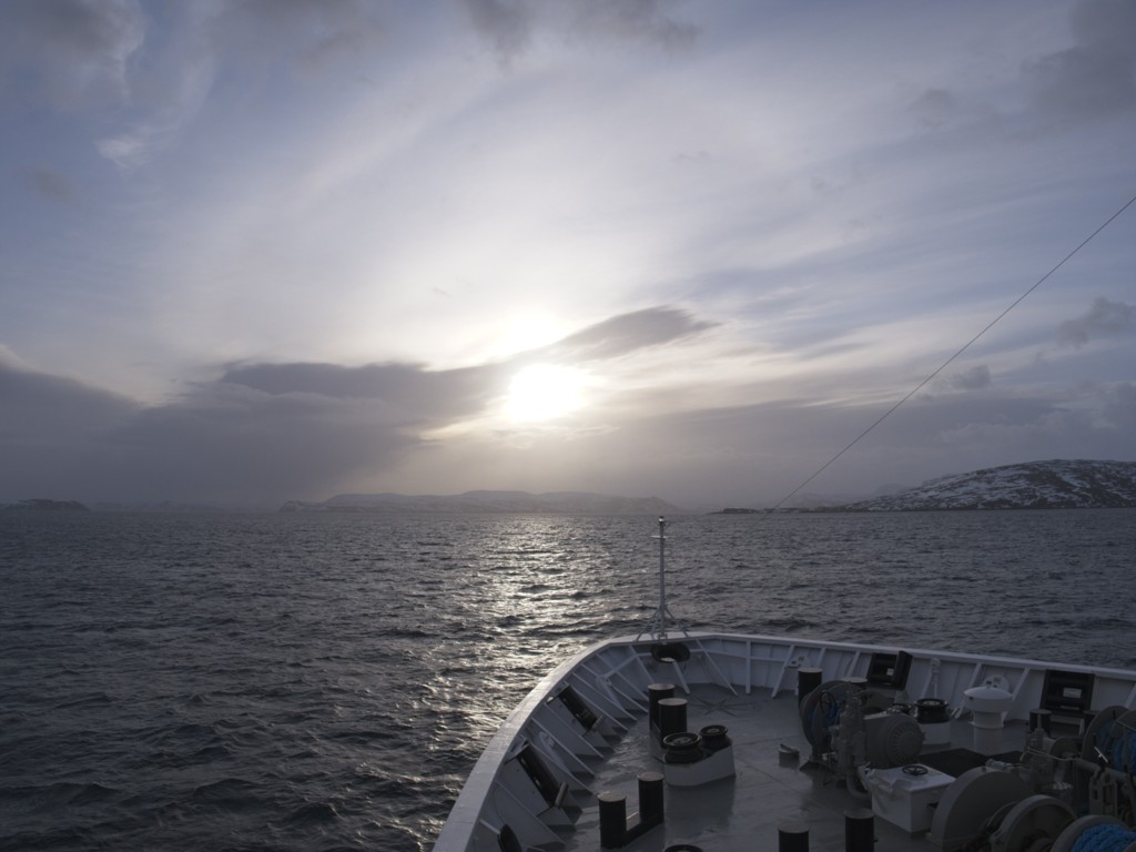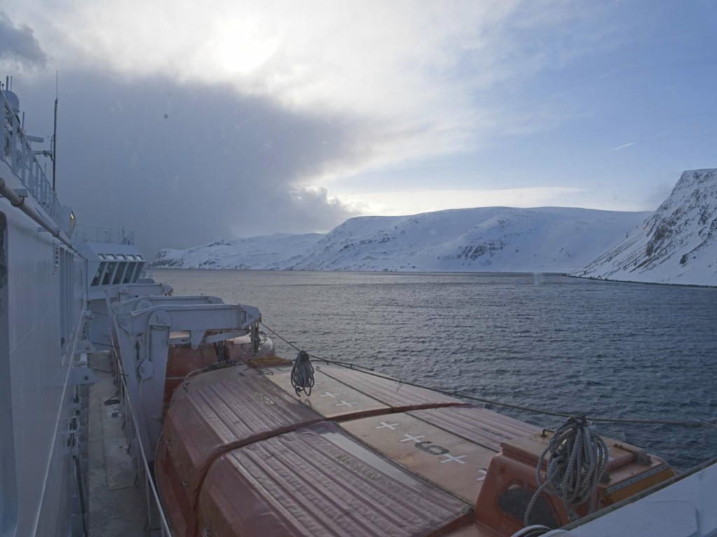 Während wir auf die Ankunft in Bergen warten, wird an Bord schon die nächste Tour vorbereitet. An der Rezeption liegen neue Postflaggen und Bilder für die nächste Versteigerung (aber keine so schönen – Danke nochmal!), und die Essens- und Getränkepakete werden schon einmal angepriesen. Seit gestern werden auf Deck 3 die Matratzen ausgetauscht, und eine der Bänke/Lagerboxen auf Deck 5 wird ebenfalls ausgetauscht. Draußen ist es derweil windig, aber schön.