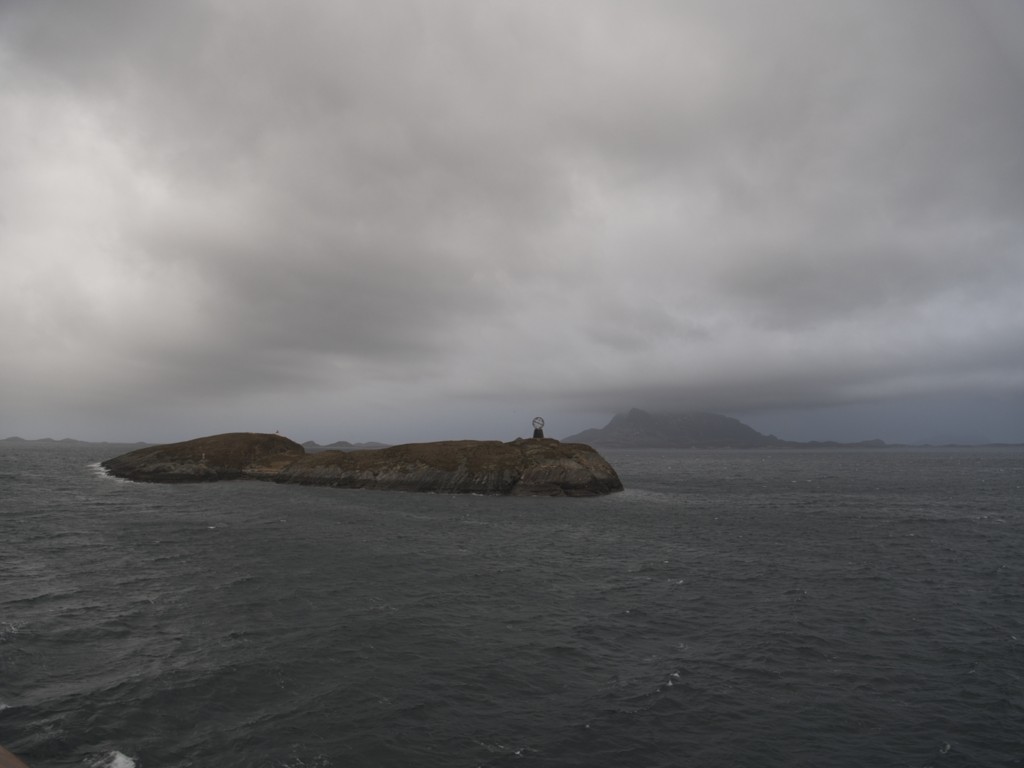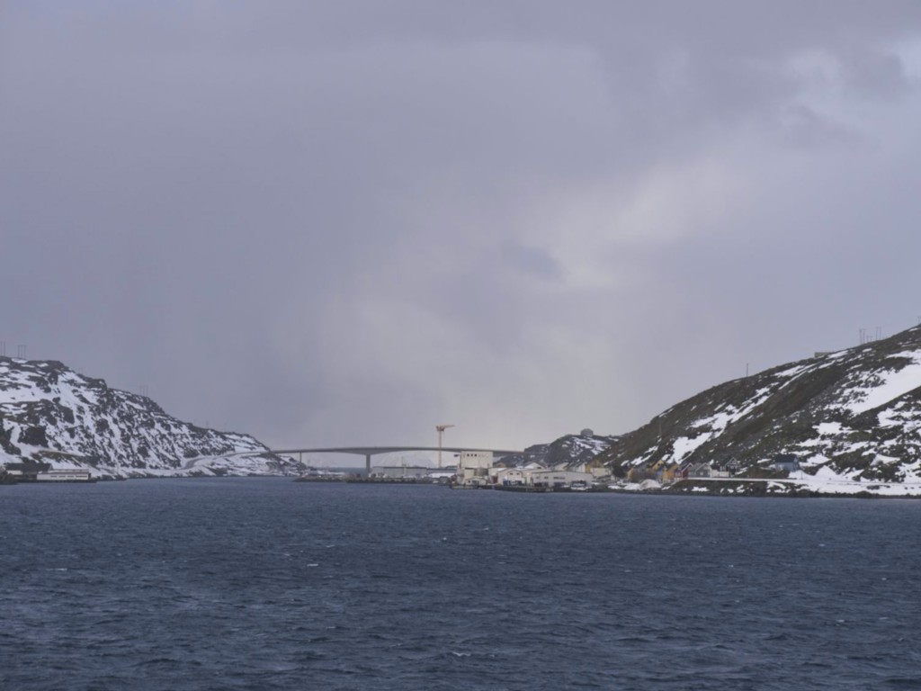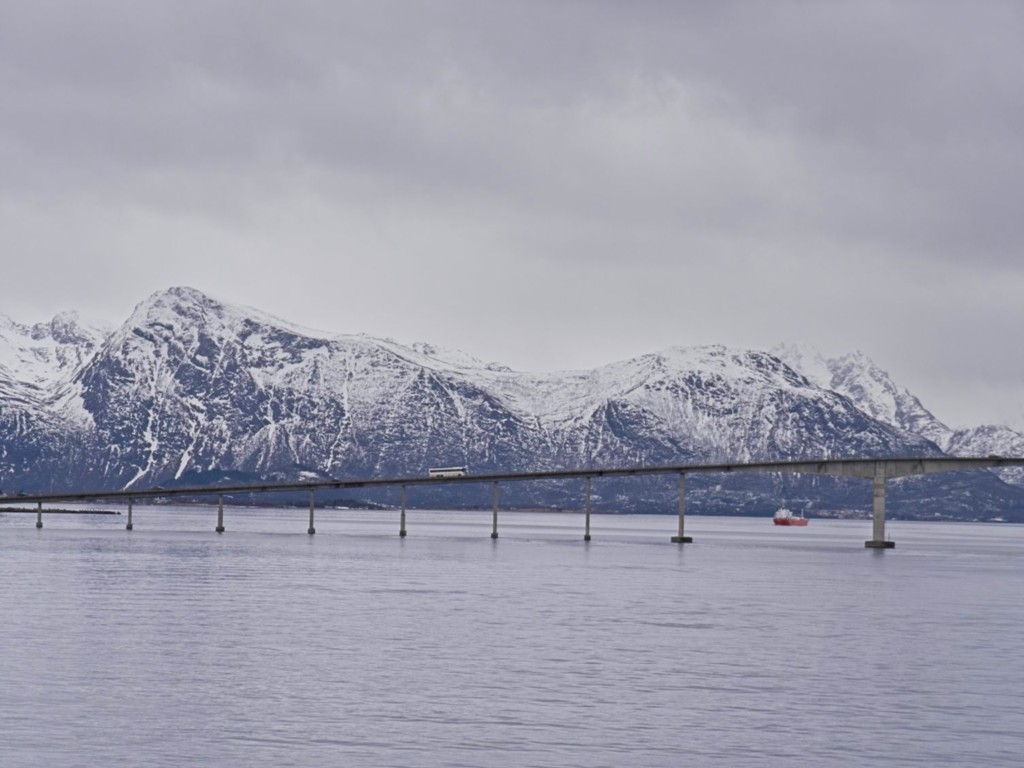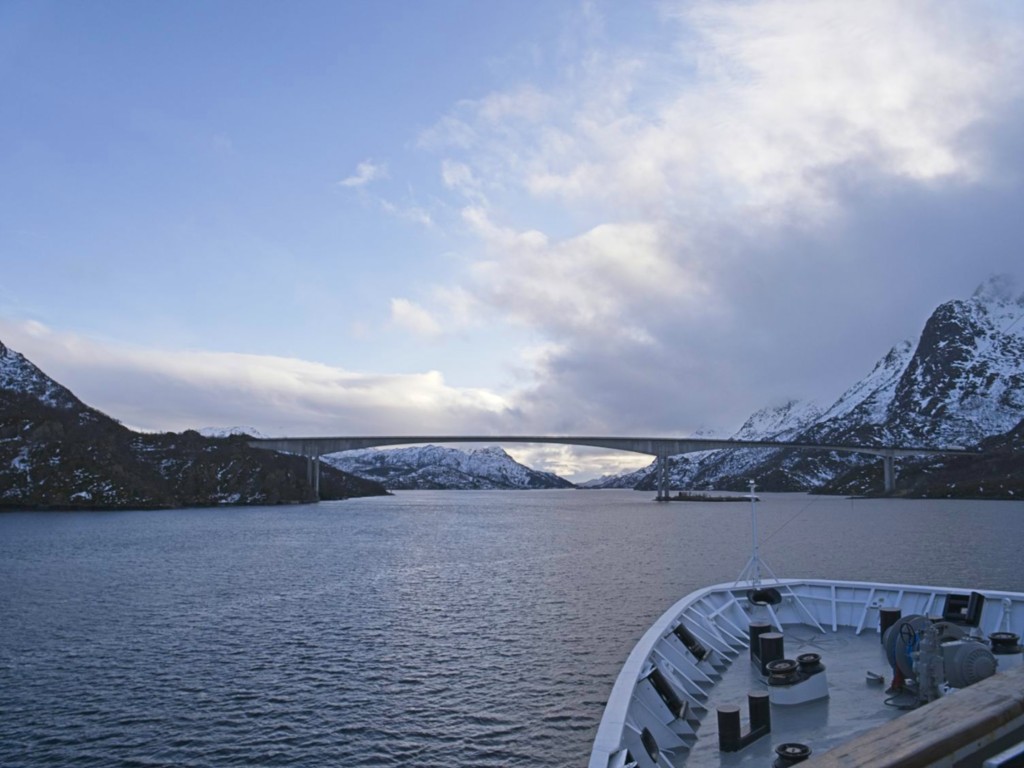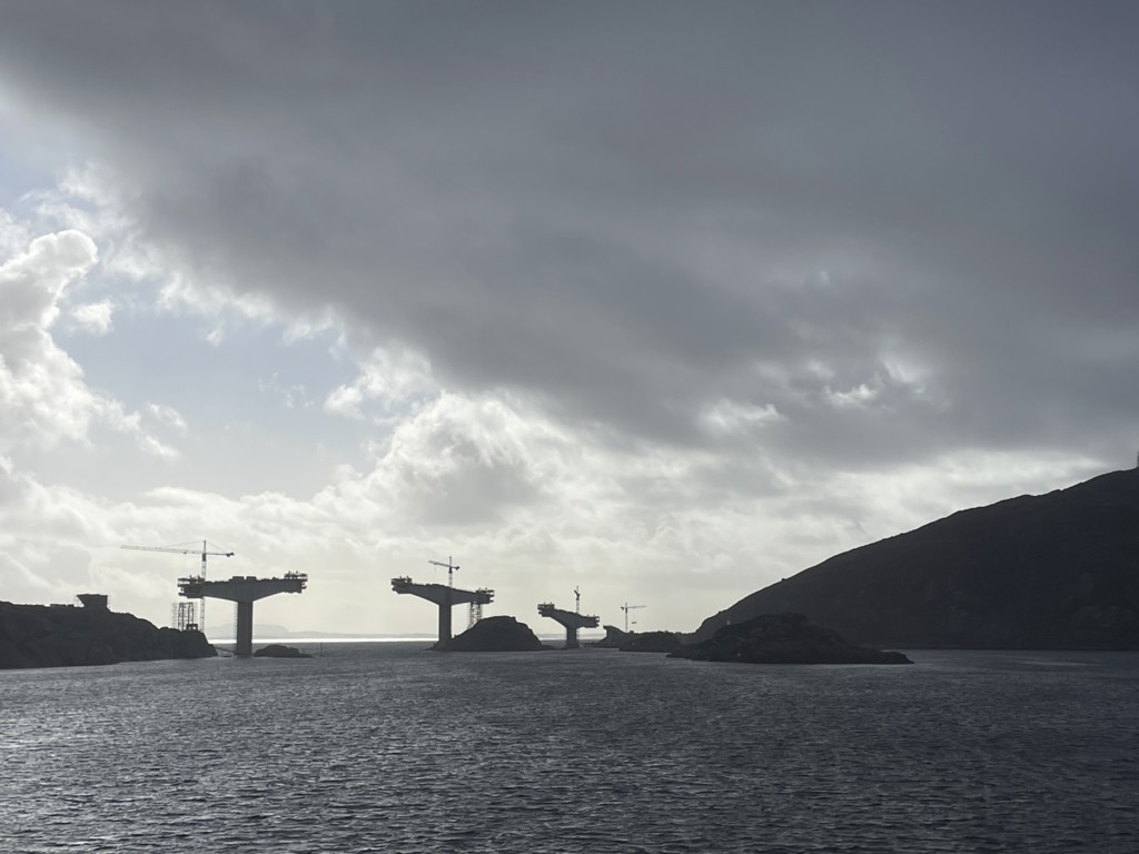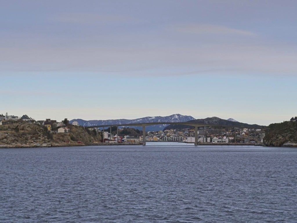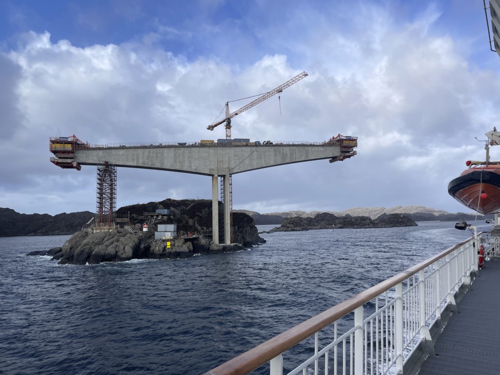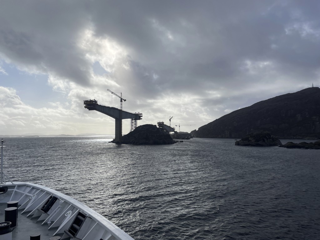 Gegen 11 Uhr erreichen wir den engen Steinsund. Der ist immer hübsch – man kommt Norwegen noch einmal richtig nahe, ohne das Schiff zu verlassen – auch wenn das Wetter am Bug nicht zum Verweilen einlädt. Die Brücke auf die Insel Ytre Sula mit ihren 130 Einwohnern nimmt auch Gestalt an – aus der Ferne könnte man meinen, dass da was aus einem Science-Fiction-Film auf uns wartet. (Für unsere Filmfreunde noch eine Quizfrage: “Ich habe da ein ganz mieses Gefühl” – welcher Film?)