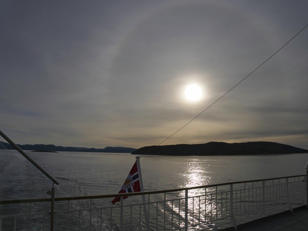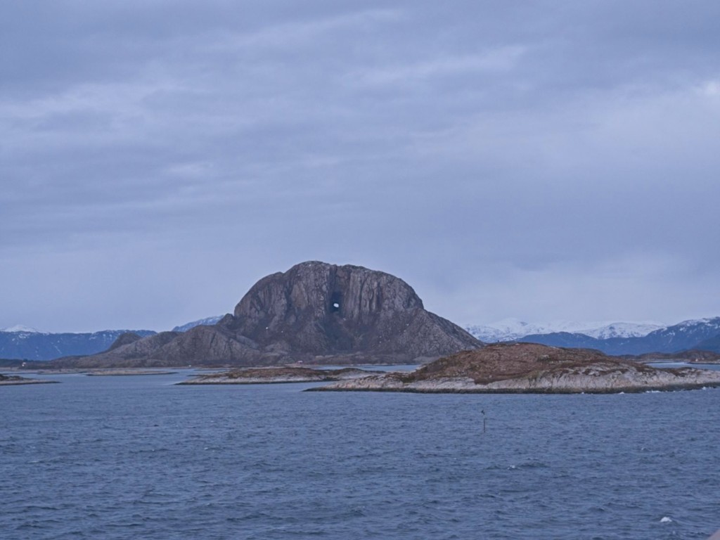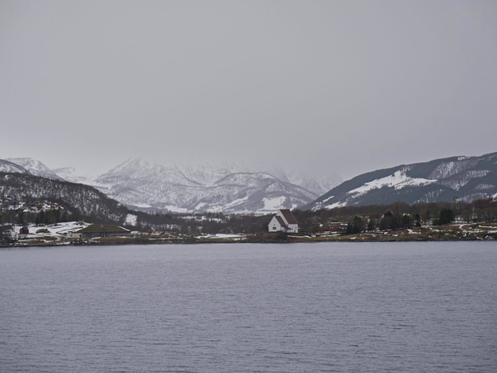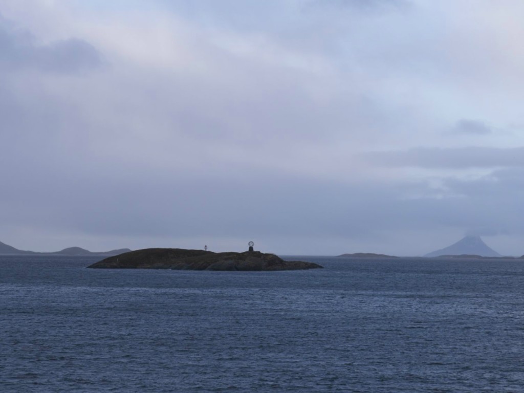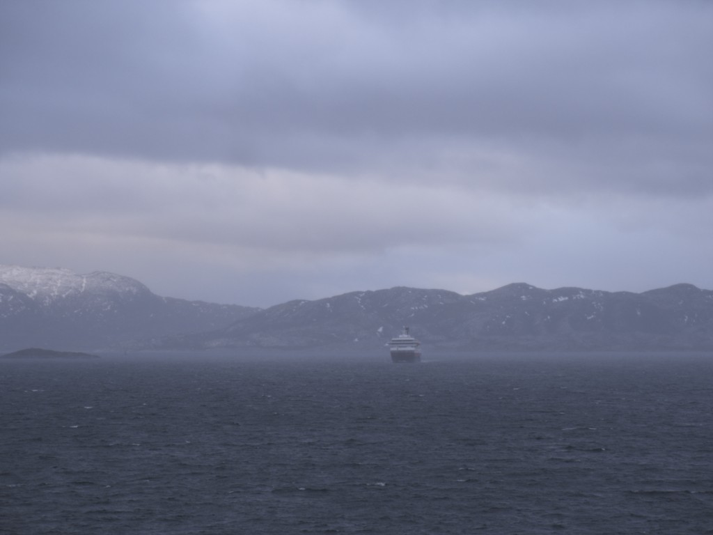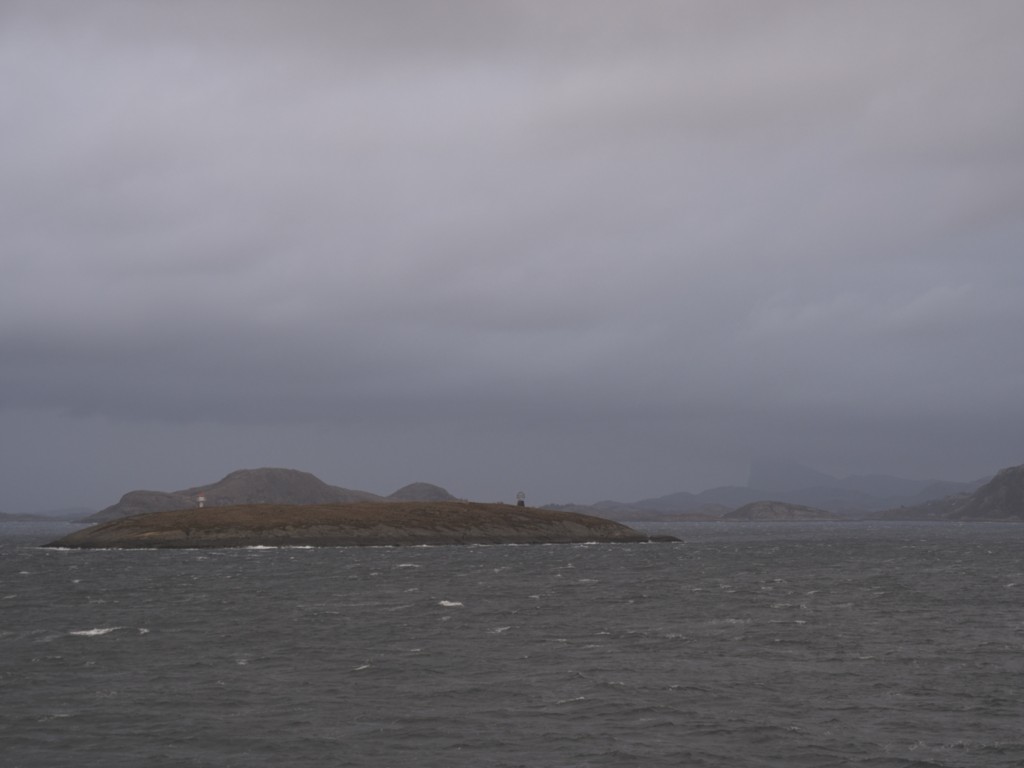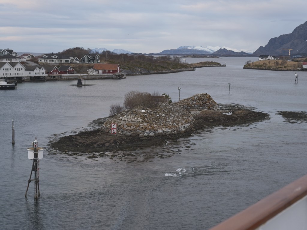 Gegen 11 Uhr erreichen wir den engen Steinsund. Der ist immer hübsch – man kommt Norwegen noch einmal richtig nahe, ohne das Schiff zu verlassen – auch wenn das Wetter am Bug nicht zum Verweilen einlädt. Die Brücke auf die Insel Ytre Sula mit ihren 130 Einwohnern nimmt auch Gestalt an – aus der Ferne könnte man meinen, dass da was aus einem Science-Fiction-Film auf uns wartet. (Für unsere Filmfreunde noch eine Quizfrage: “Ich habe da ein ganz mieses Gefühl” – welcher Film?)