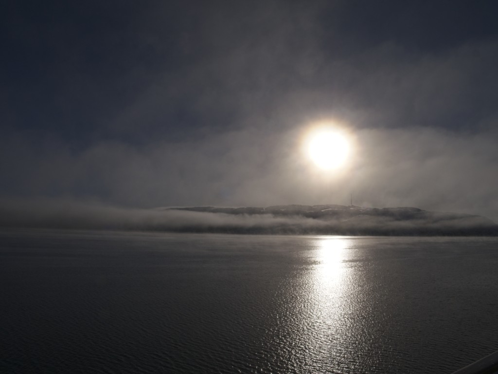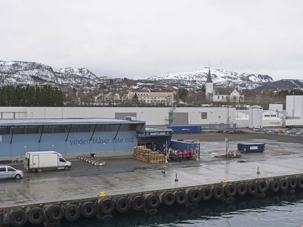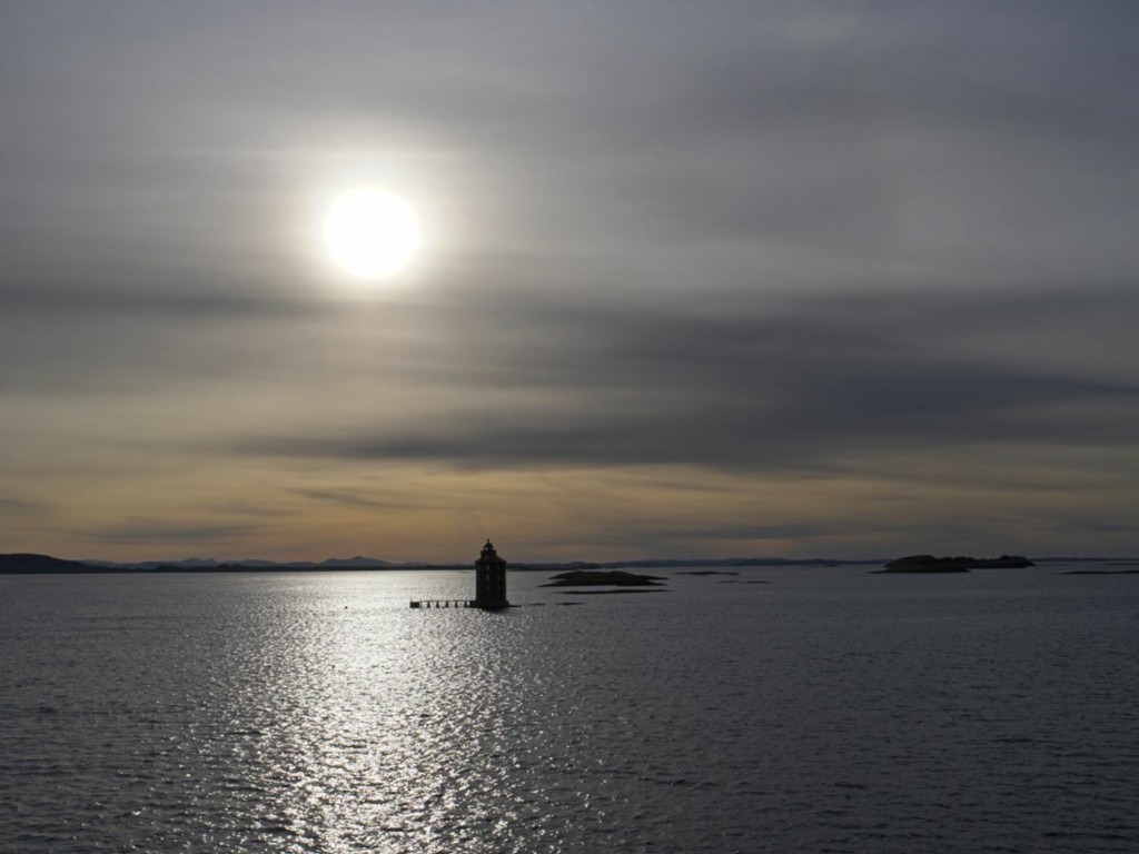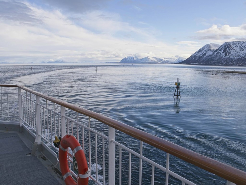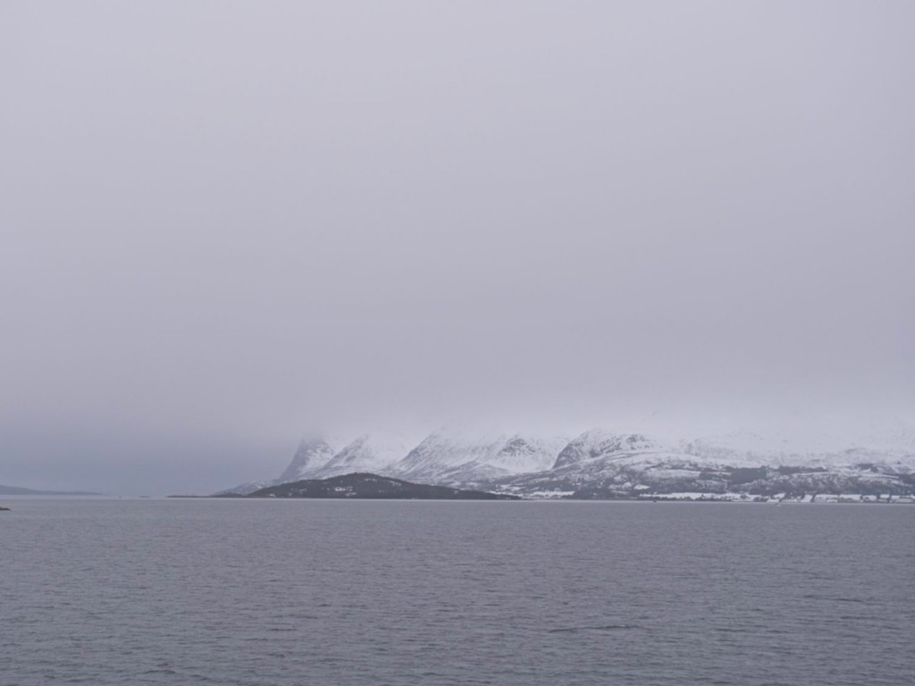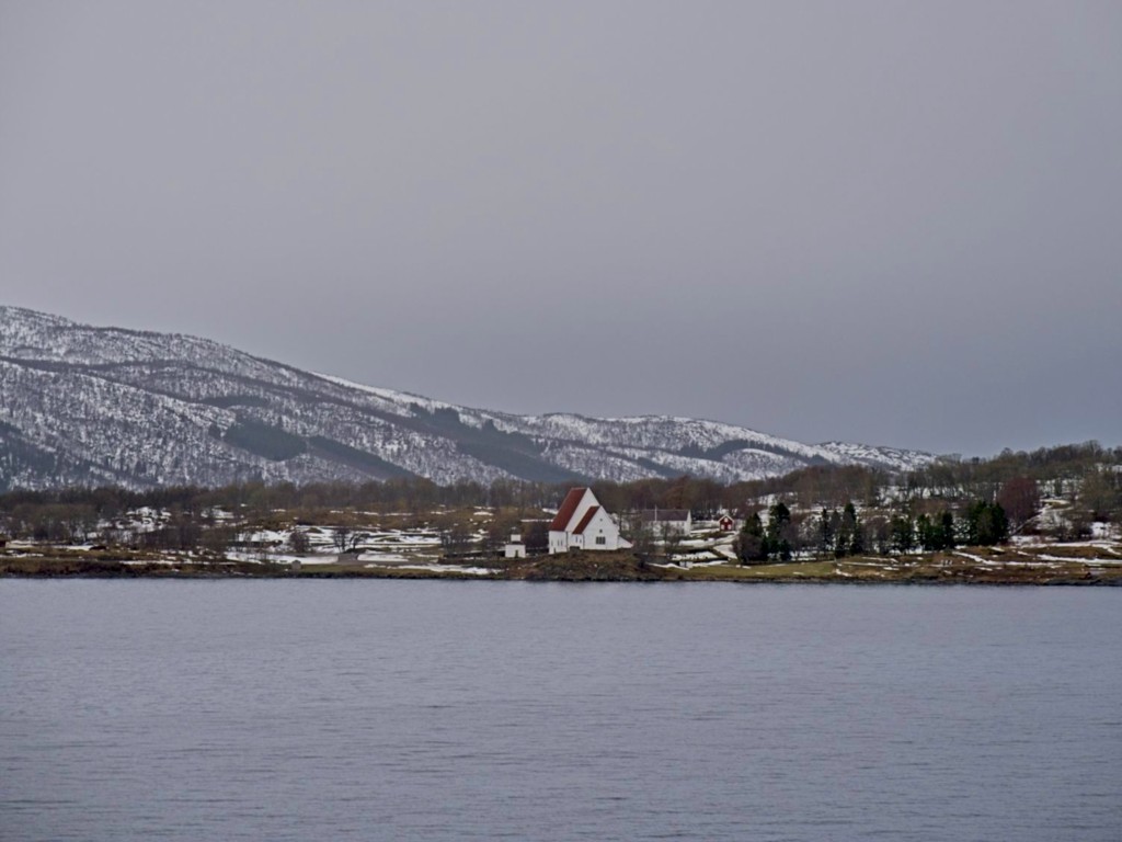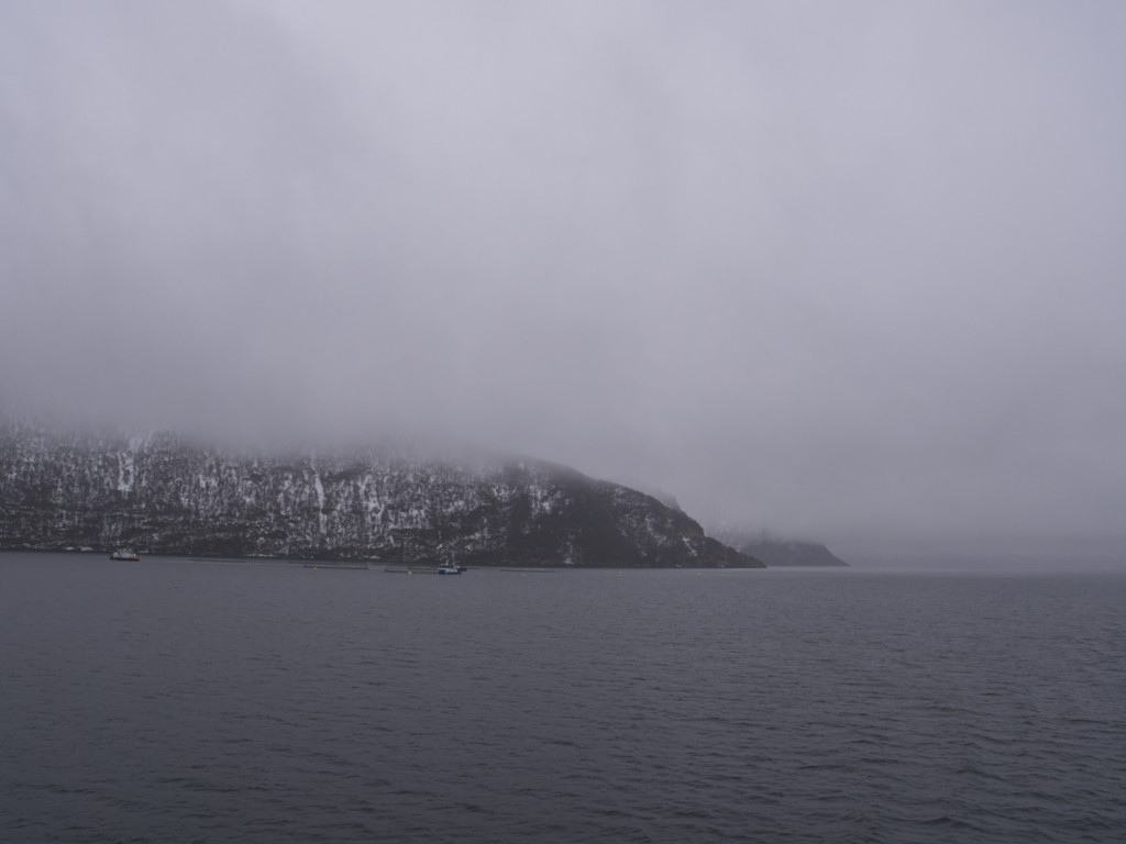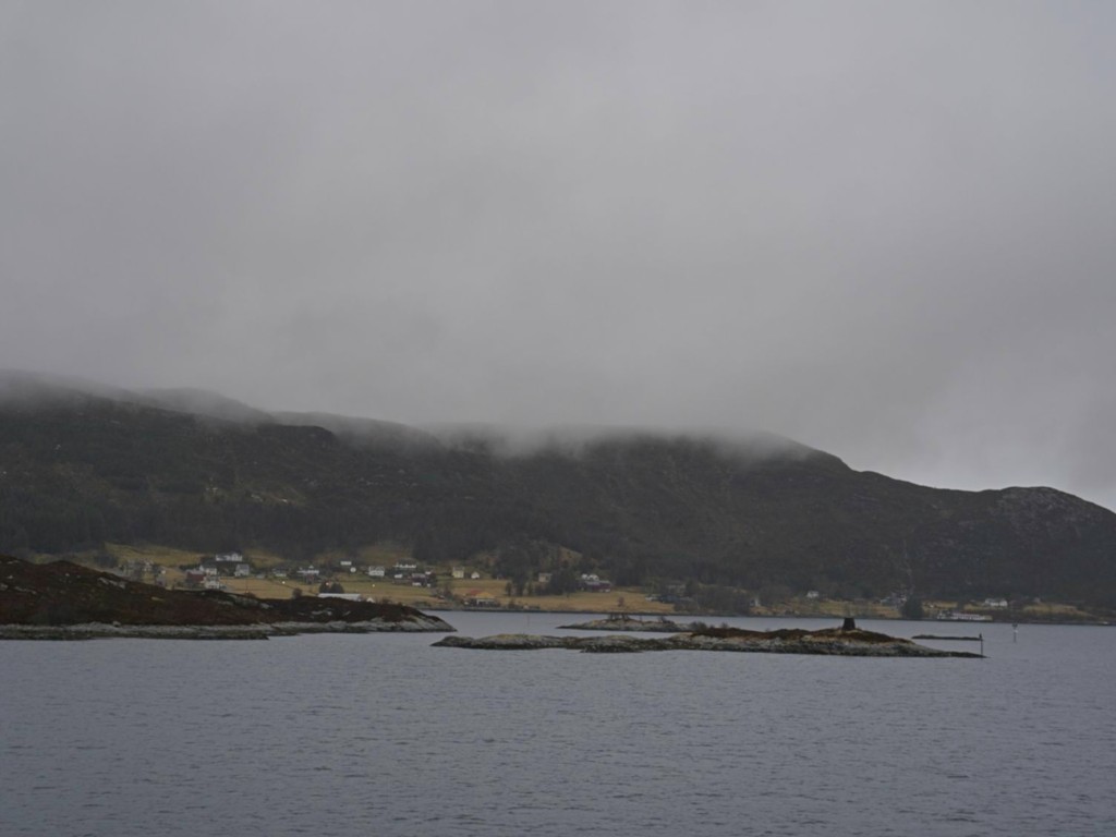 Gegen 11 Uhr erreichen wir den engen Steinsund. Der ist immer hübsch – man kommt Norwegen noch einmal richtig nahe, ohne das Schiff zu verlassen – auch wenn das Wetter am Bug nicht zum Verweilen einlädt. Die Brücke auf die Insel Ytre Sula mit ihren 130 Einwohnern nimmt auch Gestalt an – aus der Ferne könnte man meinen, dass da was aus einem Science-Fiction-Film auf uns wartet. (Für unsere Filmfreunde noch eine Quizfrage: “Ich habe da ein ganz mieses Gefühl” – welcher Film?)