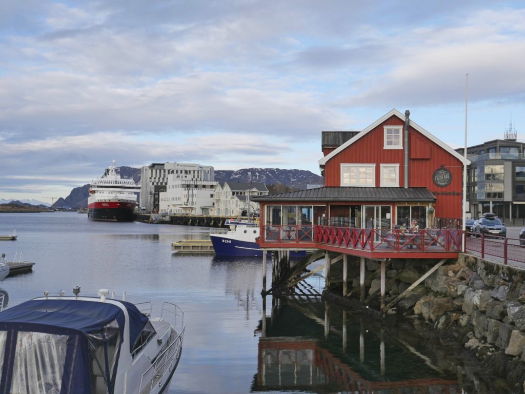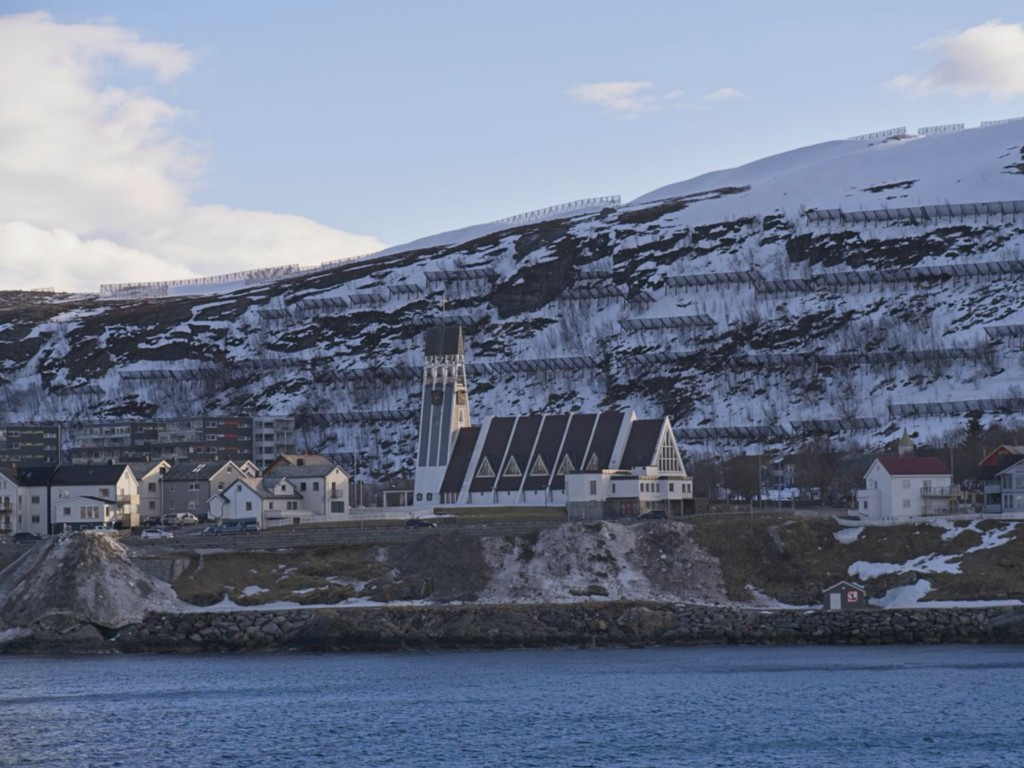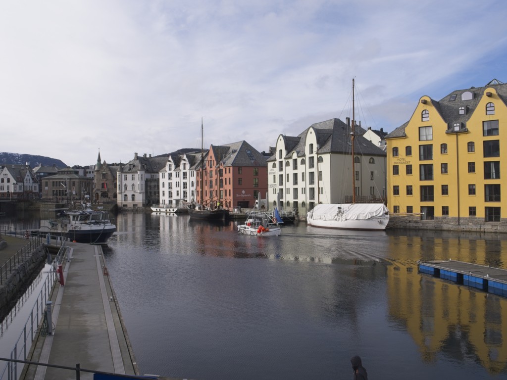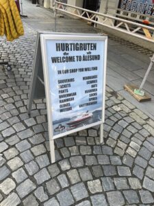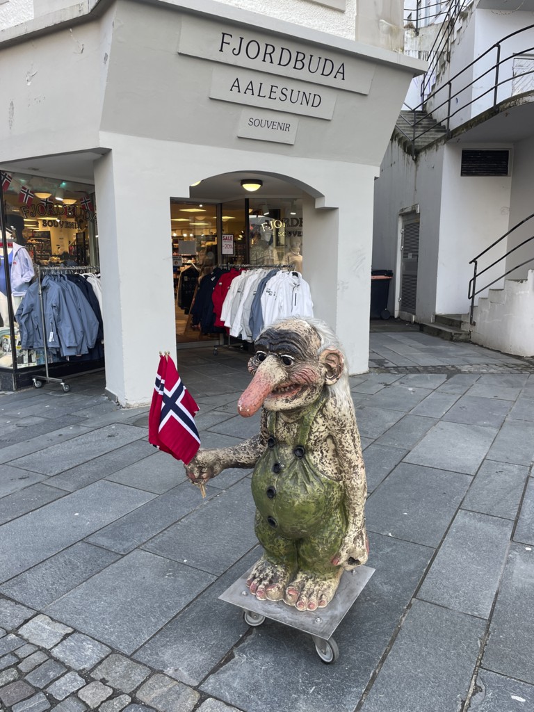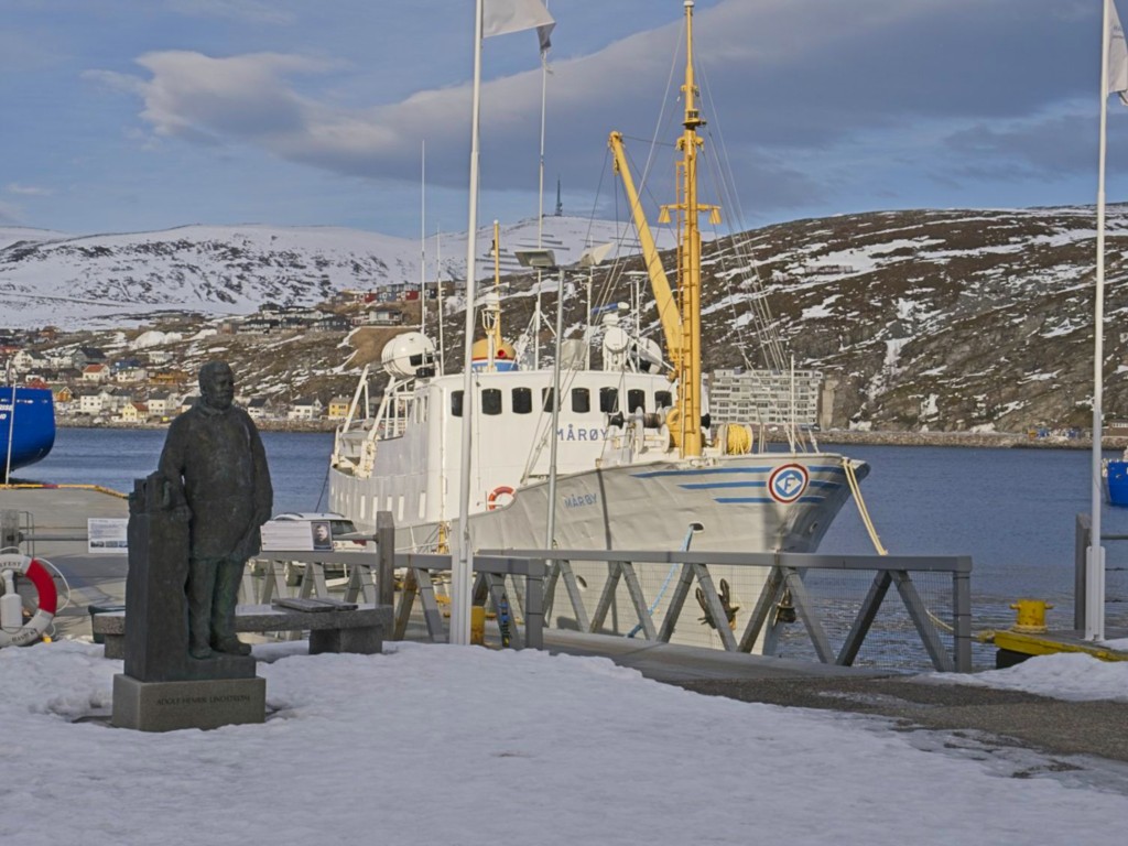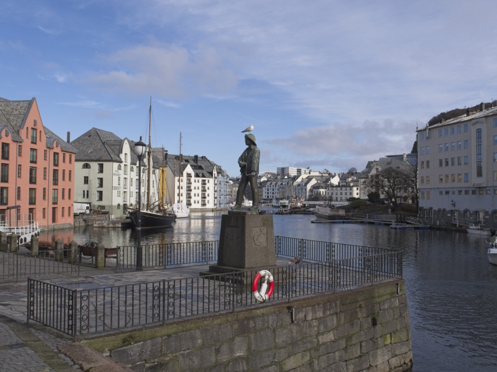 In Kristiansund wehen jede Menge Flaggen des Kristiansund Ballklubben KBK, es ist wohl Fußballsaison. Als wir anlegen, macht Kai eine schnelle Runde durch den Ort: Die beiden Statuen vom Heringsjungen und der Klippfischfrau sind ja die Standard-Stopps, aber Norwegens älteste Oper im schönen Jugendstil und die moderne Kirkelandet-Kirche sind ebenfalls gerade noch in Reichweite, wenn man etwas Gas gibt.