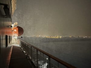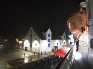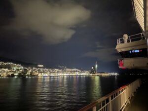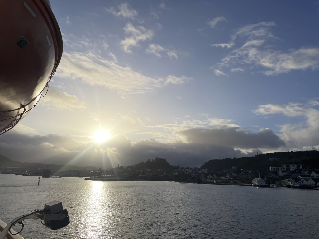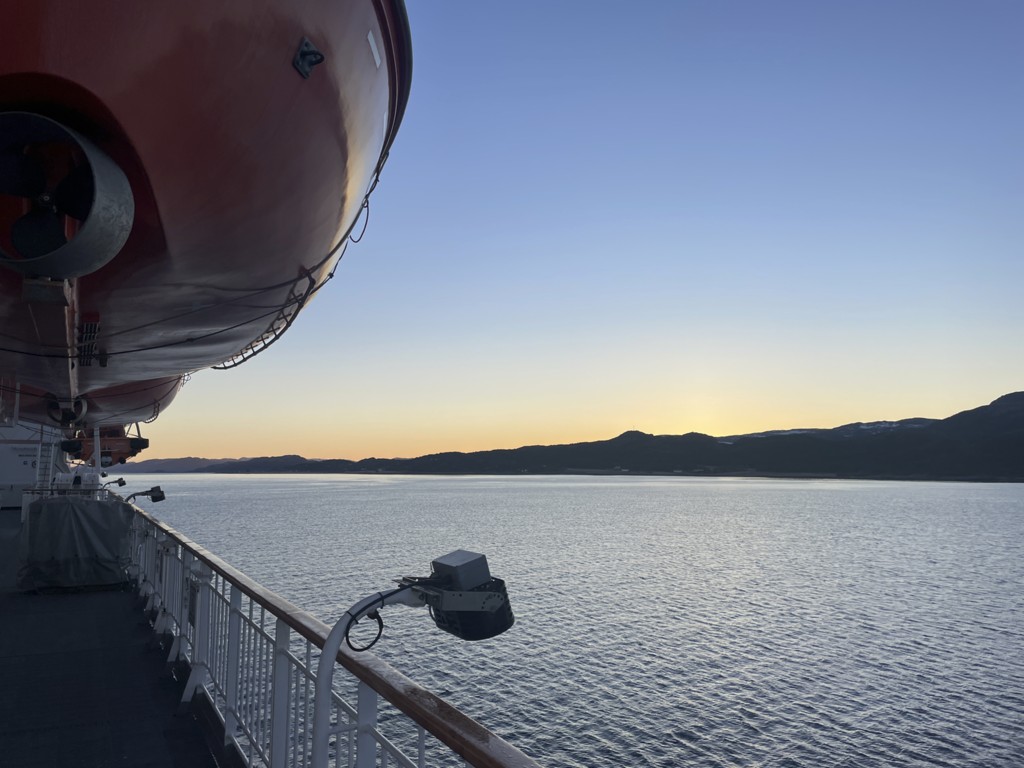 Mit ordentlich Wind legen wir in Molde an, lassen die Ausflügler wieder an Bord und gehen in den Endspurt. Die Begegnung mit der nordgehenden MS Midnatsol ist unaufgeregt – es wird nur mit Lichthupe gegrüßt – und dann ist es Zeit, den Abend ausklingen zu lassen und den Koffer final zu packen.