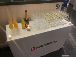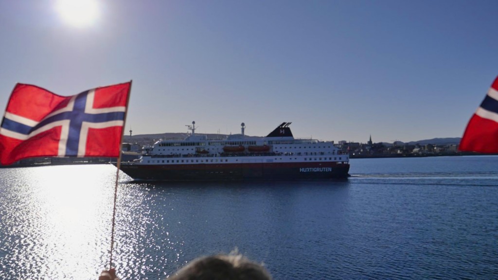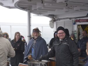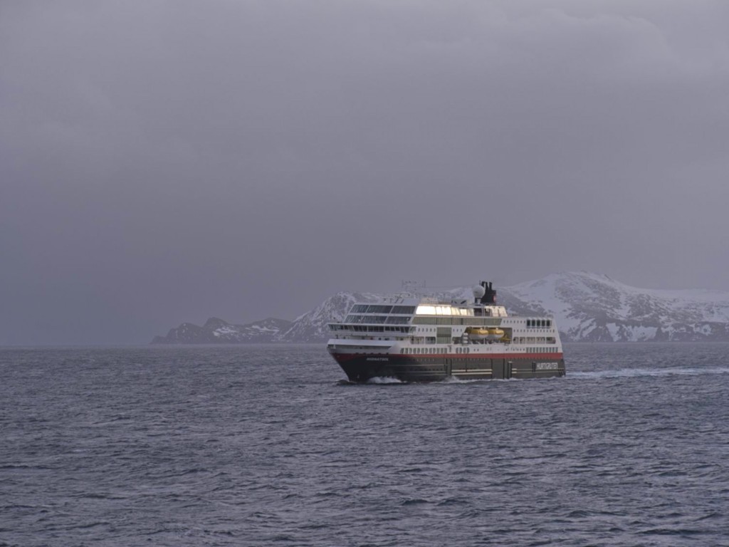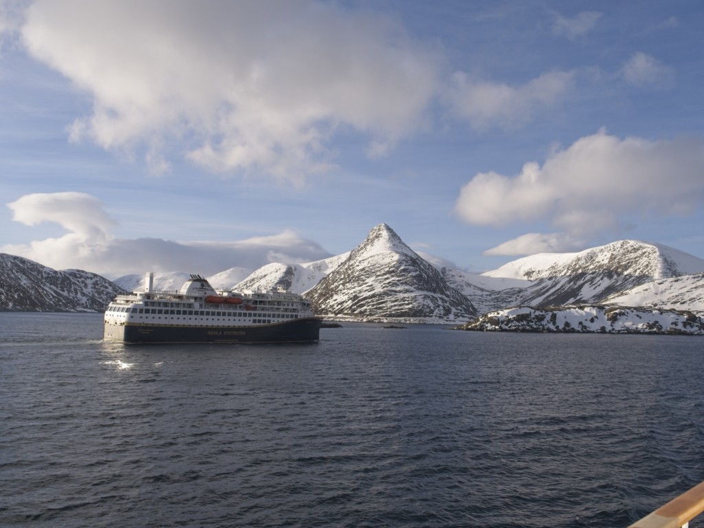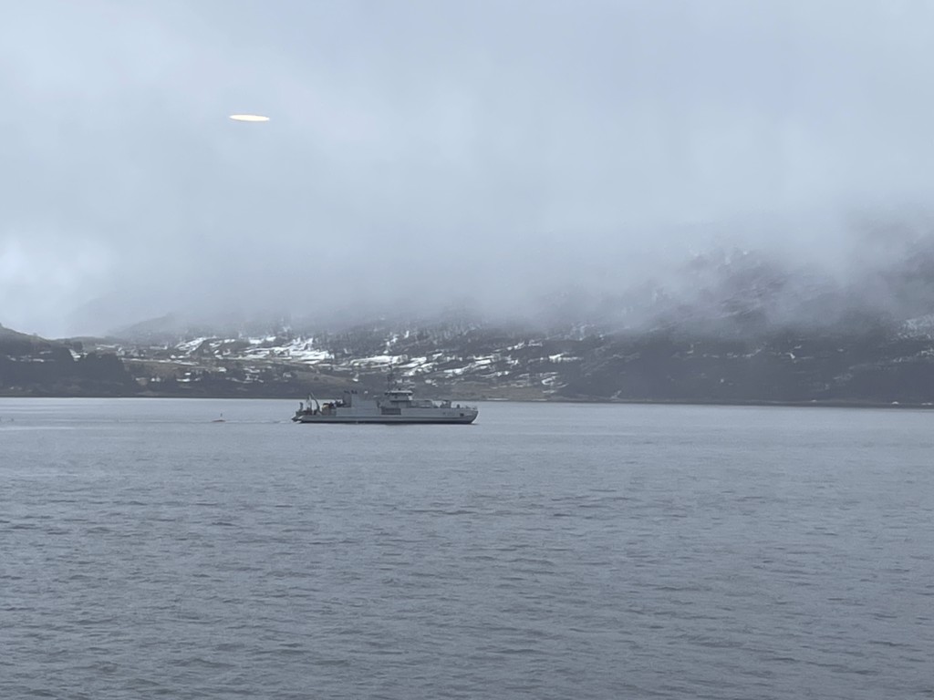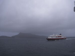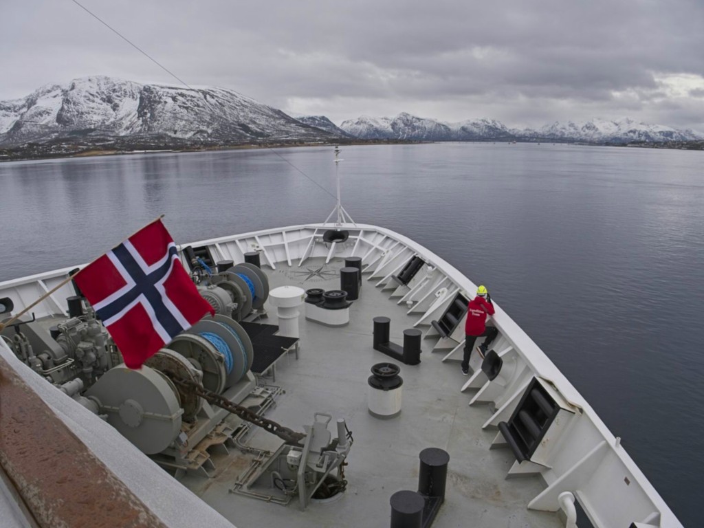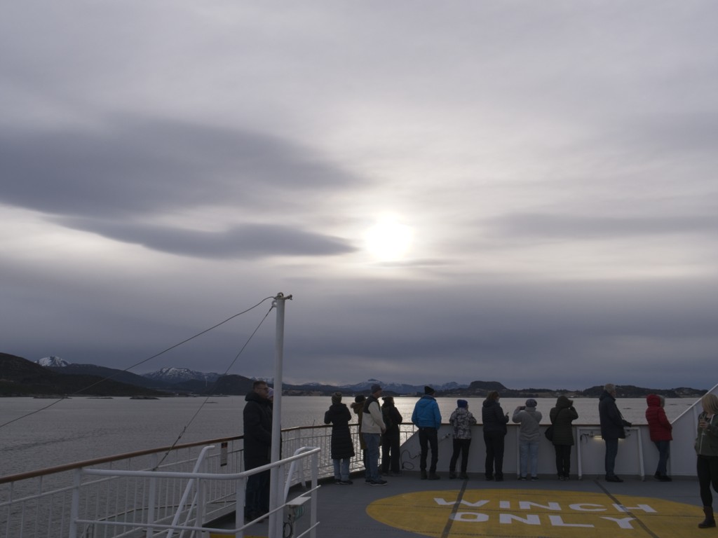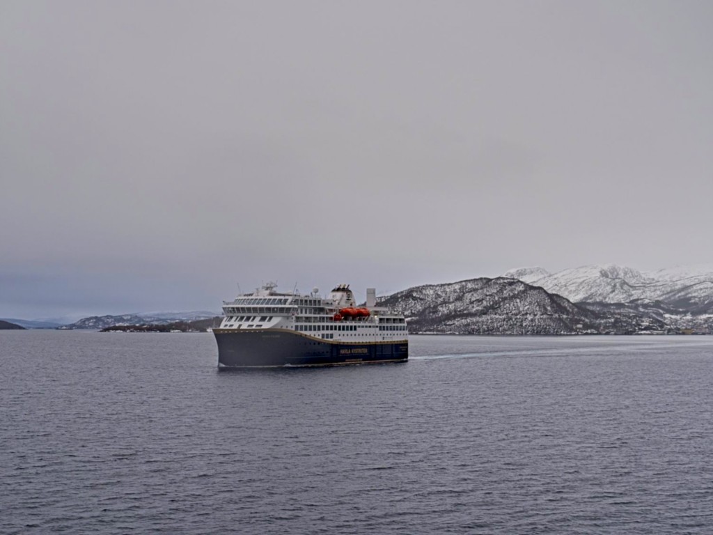 Der Vormittag hat ohnehin noch einmal ein dichtgepacktes Programm: Wir legen um 9:30 ab und begegnen der nordgehenden Hurtigrute (schöne Grüße an Sven mit seiner Gruppe auf der Kong Harald), und es gibt einen Winkewettbewerb: Auf beiden Schiffen trommelt das Expedition Team die Passagiere zusammen und verteilt auf Deck 5 Norwegen-Fläggchen. Das nordgehende Schiff ist dabei natürlich im Vorteil, da viele unserer Gäste die Rundreise bereits in Trondheim beendet haben.