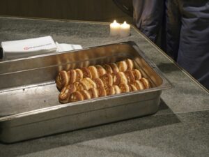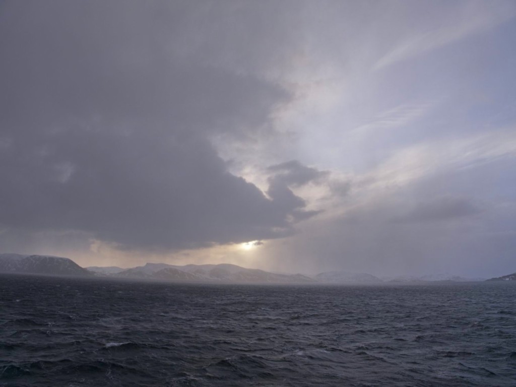 Zurück an Bord bleibt gerade noch eine halbe Stunde bis zum letzten Abendmahl: Es gibt Rentier-Haxe, und das Restaurant ist schon ziemlich leer. Viele Passagiere sind in Trondheim ausgestiegen, andere haben und in Kristiansund verlassen, um das Bergtatt Marmorbergwerk zu besichtigen, und steigen erst in Molde wieder zu. Auf der offenen Seestrecke Hustavika haben wir ordentlich Schräglage, und es geht ein guter Wind, aber der Sturm verschont uns weitestgehend.