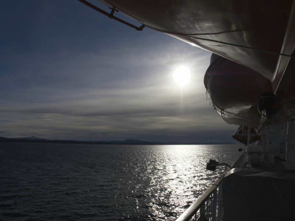 Für den Rest der Fahrt mache ich es mir wieder im Reiseleiterbüro bequem – schon mal eine Steckdose sichern:-) Der einzige Nachteil: Ich schaue nach steuerbord, also zur Seeseite. Da gibt es nicht so viel zu sehen.