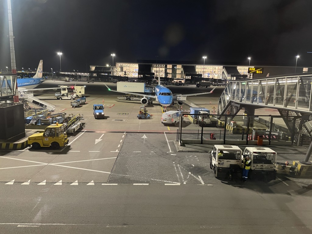 Um 17:30 geht unser Flug, und schon um 19:15 landen wir etwas früher und härter als geplant in Amsterdam auf einer Außenposition. Toll – da sich ein paar Schuhe in Norwegen verabschiedet hat, habe ich meine Jacke im Koffer; die KLM-Flugzeuge sind eh eng genug. Aber ich habe Glück: Es geht über die Passagiertreppe (Made in Shenzhen, China) in den chinesischen Elektro-Bus, und ich brauche keine Jacke. Und ich bin wirklich in Europa, nicht in China, glaube ich…