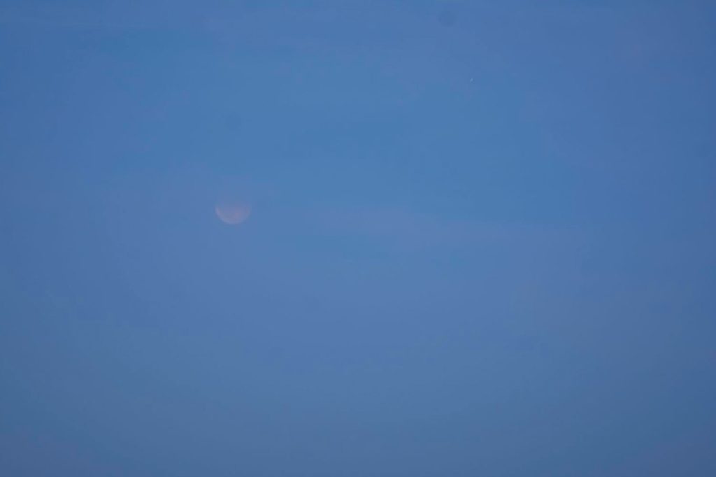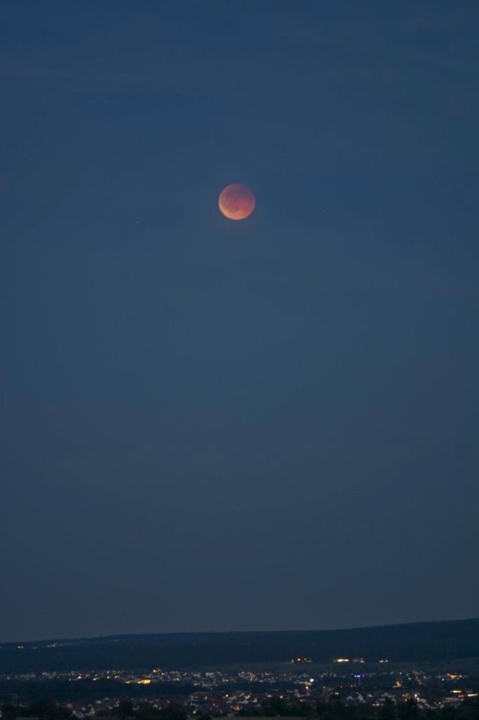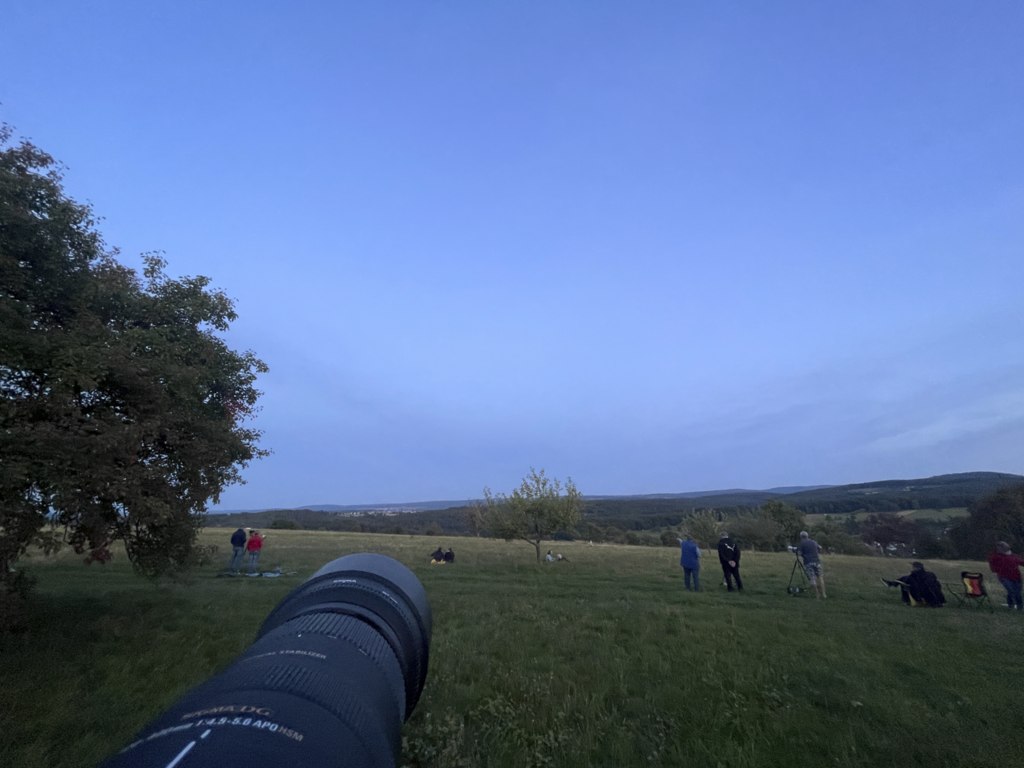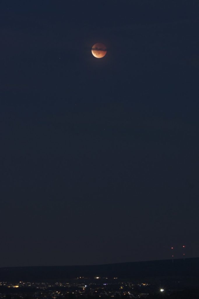 Wie alle anderen schaue ich gespannt, aber erfolglos Richtung Mondaufgang. Irgendwer meint, dass die Mondfinsternis wohl “Powered bei Deutsche Bahn” ist. Ich nutze die Zeit zum Technik-Test: Wie kriege ich mit dem Setup, den ich zur SoFi verwenden will, ein scharfes Bild hin? So weit über die Landschaft bis zum Horizont ist das eh sportlich. Und ich werde wohl den Bildstabilisator vom Objektiv tatsächlich abschalten müssen und mindestens eine Sekunde Spiegelvorauslösung nutzen müssen, damit das passt. Und bei 400mm Brennweite maximal etwa 3 Sekunden Belichtungszeit, lieber weniger. Und manueller Fokus ist ebenfalls ratsam. Blöd.