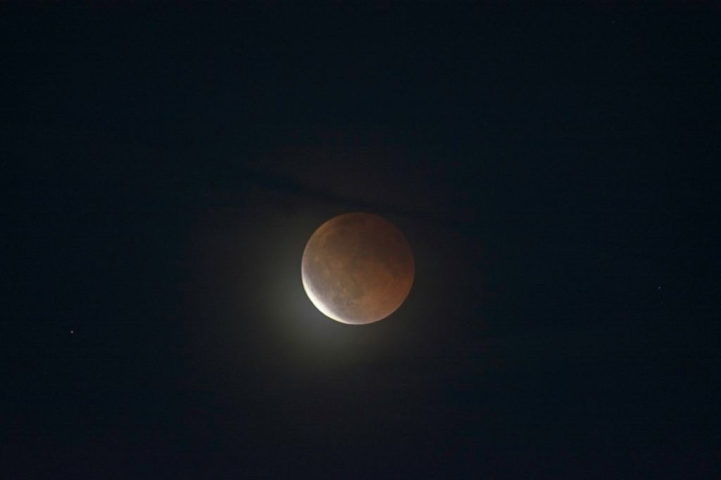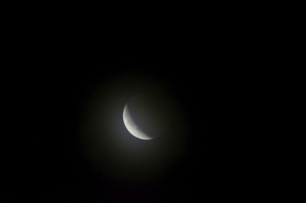 Damit haben wir die Totalität gerade noch erwischt, um 20:53 verlässt er den Erdschatten bereits wieder. Im Fernglas ist das ein sehr schöner Anblick, und das Spektiv zeigt, dass die Schleierwolken einen Unschärfefilter über das Bild legen: Perfekt scharf ist er nicht, eher etwas verwaschen. Aber trotzdem schön.
