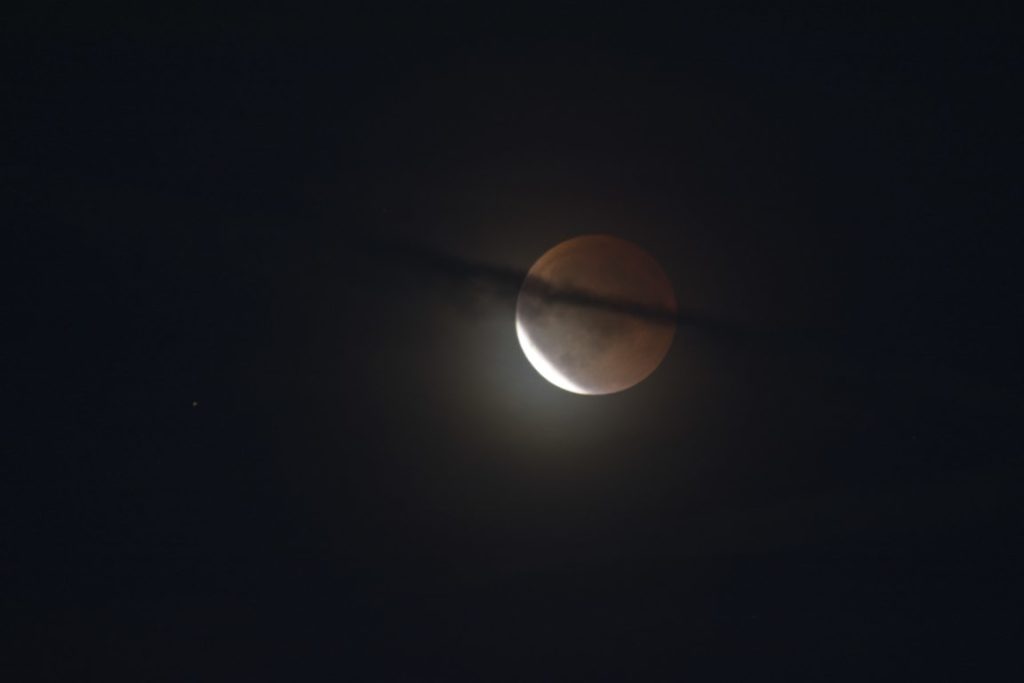 Drei Bilder im Abstand von einer Minute (20:57, 20:58 und 20:59), und der Mond zieht flott an einem Wolkenband/Kondensstreifen vorbei. Auch hübsch. Und links erstrahlt er schon im Sonnenlicht – ein Hauch von Diamantring, wenn das eine SoFi wäre. Jedenfalls ist es beeindruckend, was das für ein Helligkeitsunterschied ist zwischen dem Teil vom Mond, der schon wieder im Sonnenlicht gleißt, und dem noch verfinsterten Teil des Vollmonds.